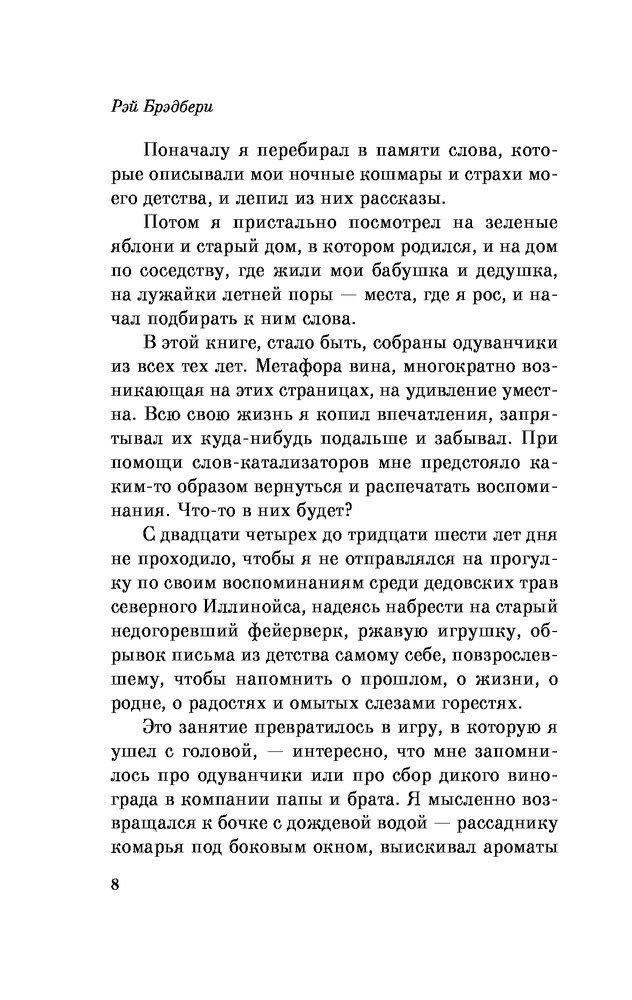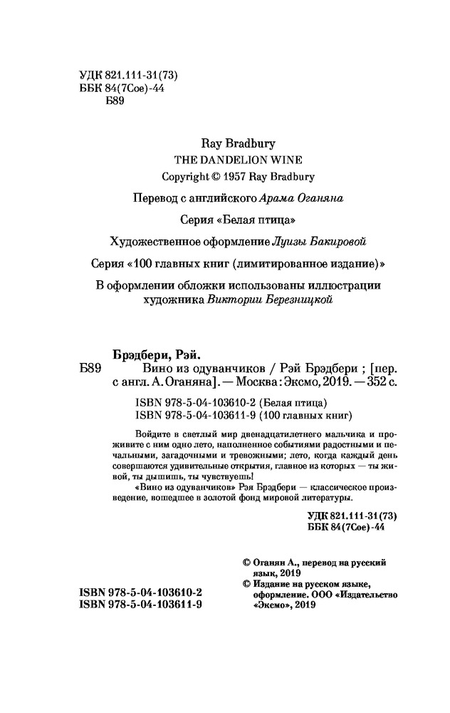 Серия: Белая птица Войдите в светлый мир двенадцатилетнего мальчика и проживите с ним одно лето, наполненное событиями радостными и печальными, загадочными и тревожными; лето, когда каждый день совершаются удивительные открытия, главное из которых — ты живой, ты дышишь, ты чувствуешь! «Вино из одуванчиков» Рэя Брэдбери — классическое произведение, вошедшее в золотой фонд мировой литературы. |