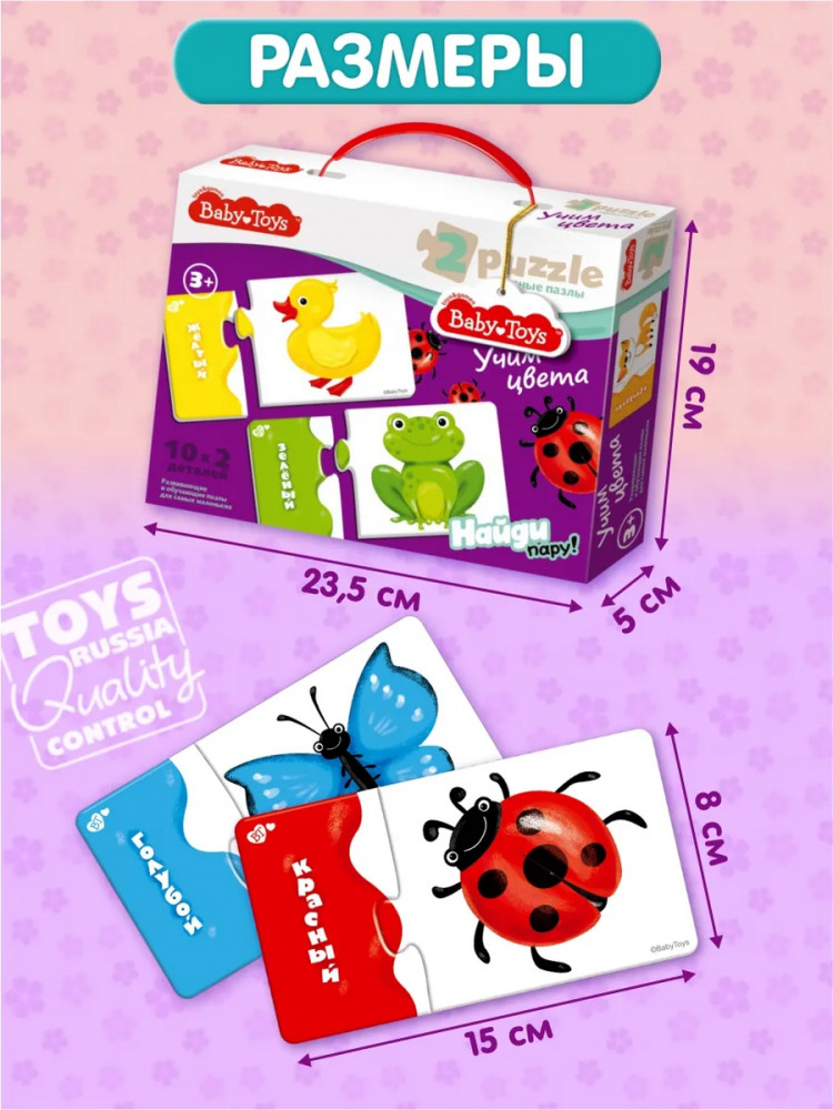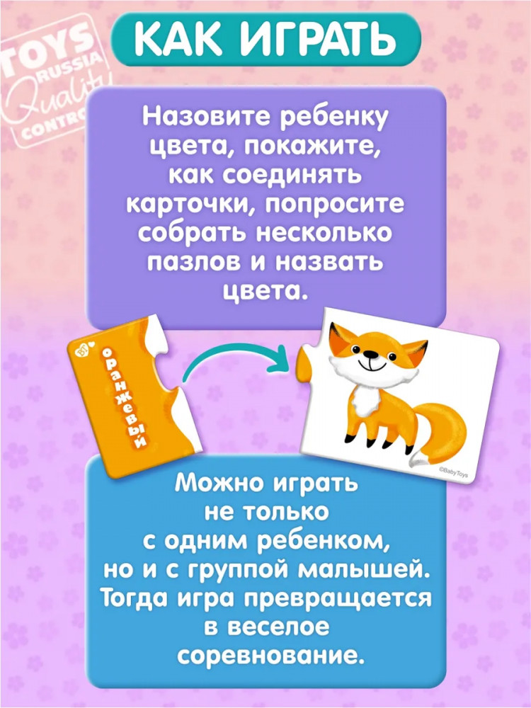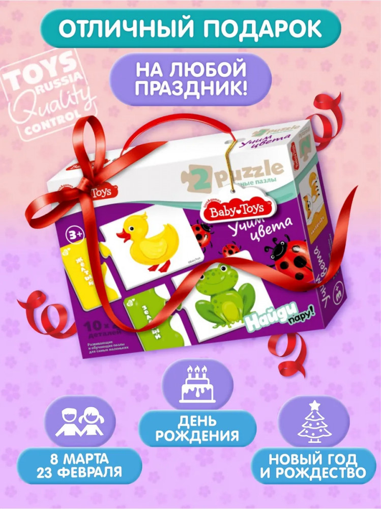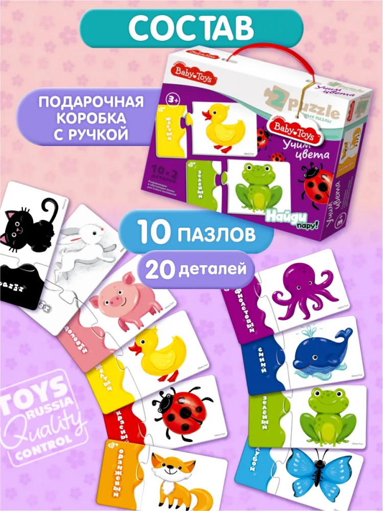 💳 Оплатить за товар можно при получении 🇰🇿 Есть бесплатная доставка по Казахстану от 1 дня 🎁 Копите бонусы с каждой покупки Серия: Найди пару Увлекательное развивающее занятие — собирание пазлов всегда нравится малышам. Играя с его деталями. Кроха сможет развлечься и выучить основные цвета. На одной карточке изображено милое животное или насекомое, а на другой указан его цвет. Мама сможет научить кроху собирать пазлы, обращая внимание на цвет и контур. |