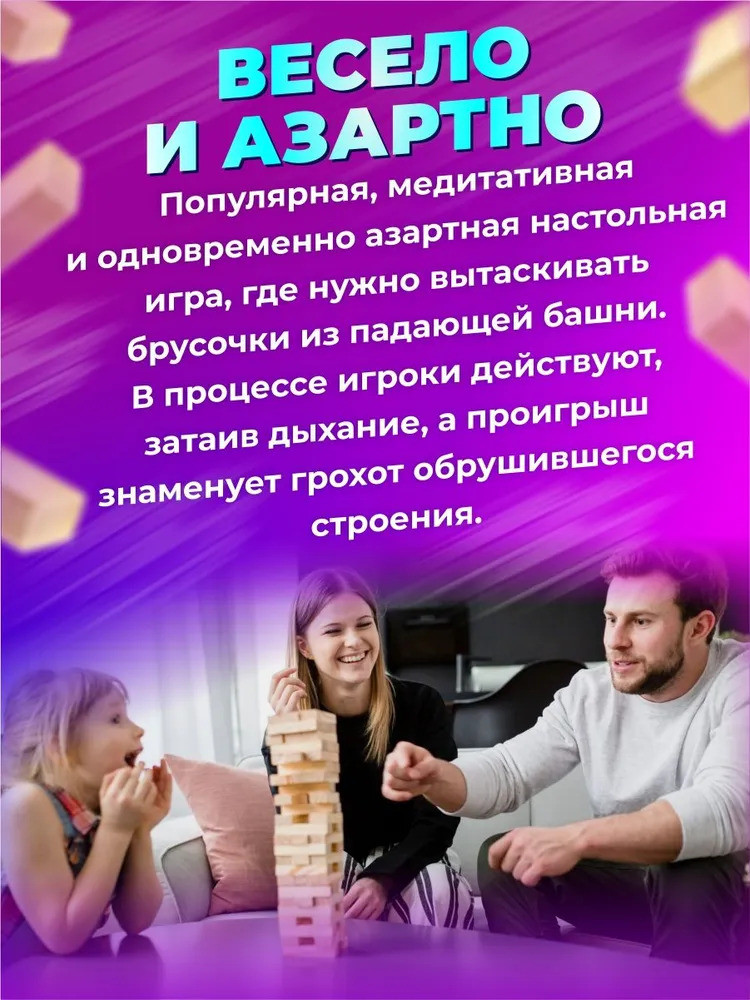 Купила недавно, долго искала такую игру, дети играют и взрослые тоже, бруски качественные, приятно пахнут, играем с удовольствием.
