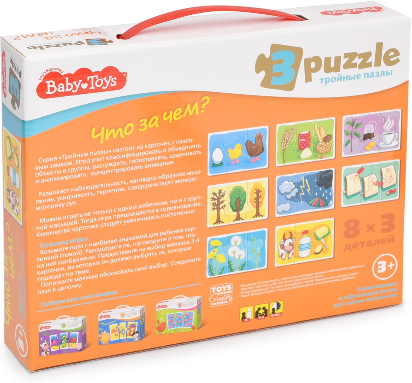 Десятое королевство Макси-пазл «Что за чем?»В данный момент этот товар отсутствует в продаже. Возможно, у нас найдется аналогичный или похожий товар здесь. Серия: Тройные пазлы Это не просто набор ярких пазлов, а прекрасное обучающее пособие, помогающее родителям тренировать логическое мышление малышей и расширять их кругозор. К тому же, в процессе соединения элементов, дети еще и улучшают мелкую моторику рук. |