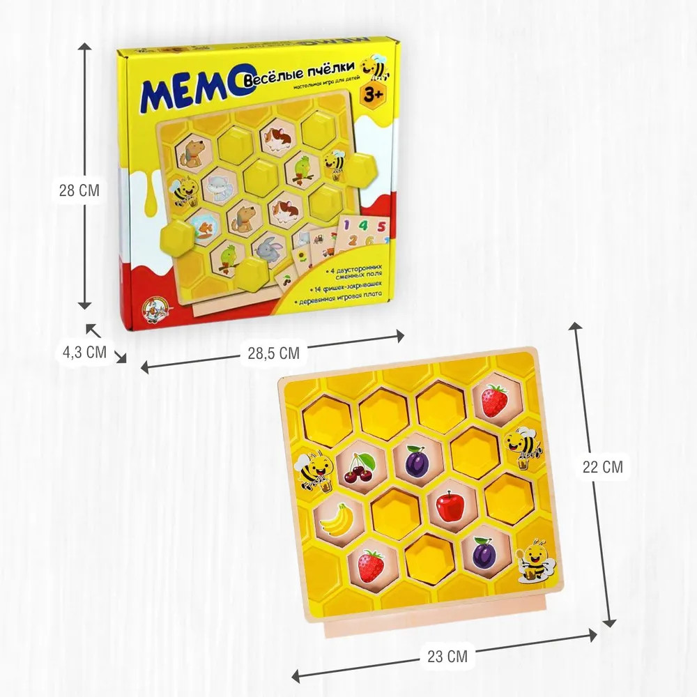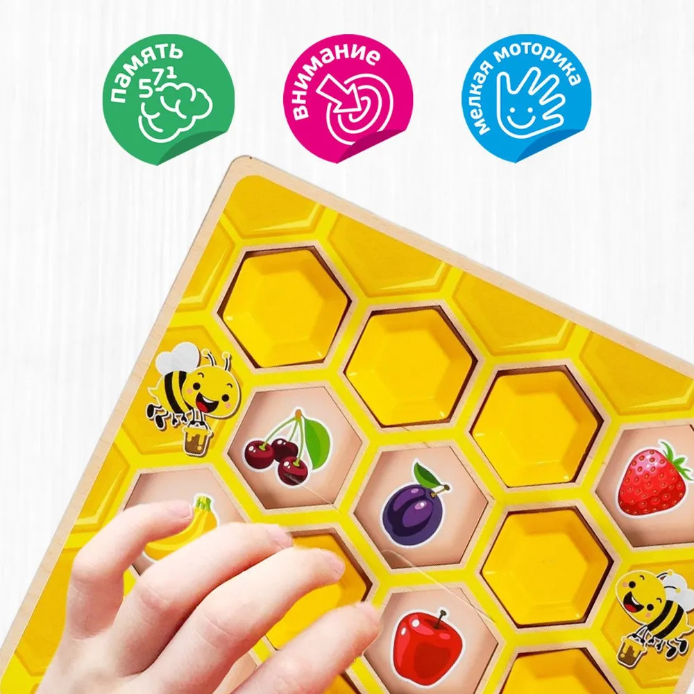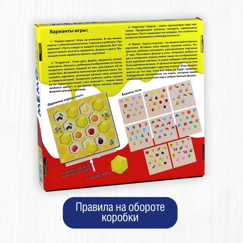 💳 Оплатить за товар можно при получении 🇰🇿 Есть бесплатная доставка по Казахстану от 1 дня 🎁 Копите бонусы с каждой покупки Тренируйте память малыша с увлекательной игрой «Мемо: Веселые пчелки»! Перед началом игры выберите поле с картинками и вставьте его в игровую плату. Играйте в «Мемо: Веселые пчелки» разными способами: попросите малыша закрыть фишкой ячейку с каким-то предметом или персонажем, имеющим нужные характеристики, отыскивайте пары одинаковых картинок и накрывайте их фишками или наоборот найдите на закрытом поле. Игра тренирует внимание, наблюдательность, развивает зрительную память и мелкую моторику рук малыша. |