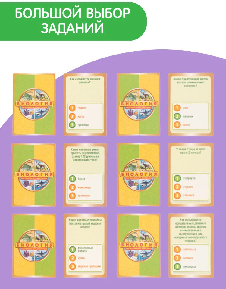 Отличная серия игр настольных викторин. Качество хорошее, вопросы интересные. Мы замешали из этой же серии в одну стопку вопросы "наука и техника", "биология" и "география", получилось около 1000 вопросов из разных категорий, только поле берём от игры "география" потому-что там есть карта мира и есть вопросы по географии, где необходимо дать ответ показав место на карте.
