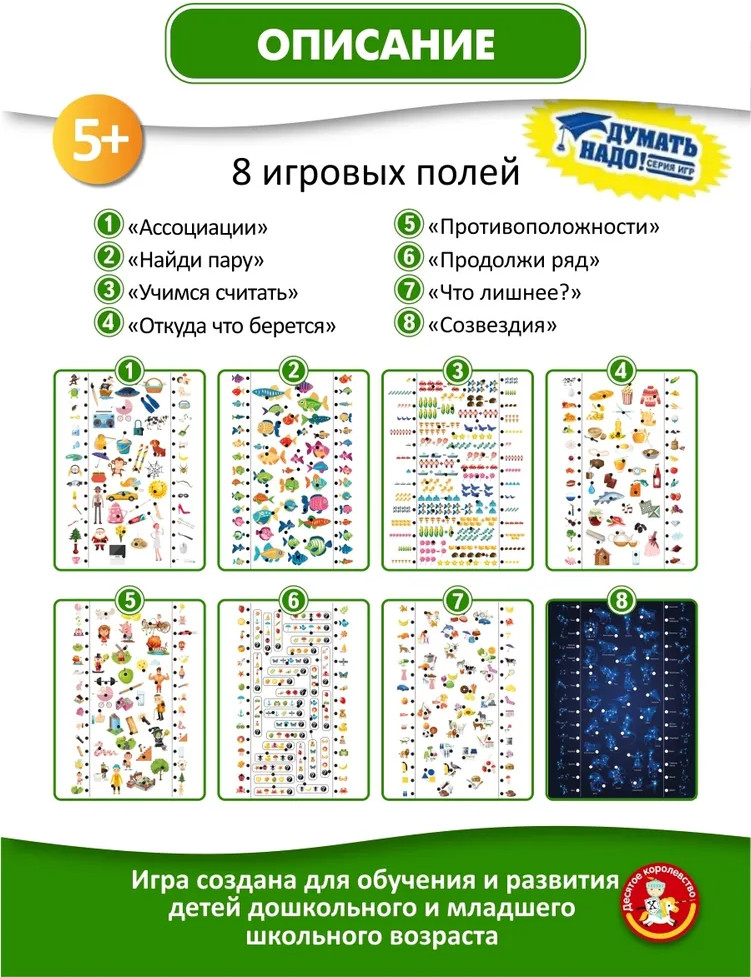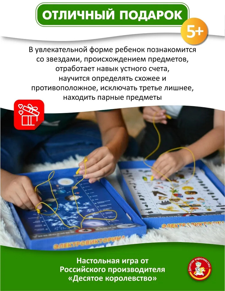 Десятое королевство Игра настольная «Электровикторина. Школа дошколят»В данный момент этот товар отсутствует в продаже. Возможно, у нас найдется аналогичный или похожий товар здесь. Серия: Думать надо! Весело играть и изучать окружающий мир, закономерности, находить логические связи возможно вместе с электровикториной «Школа дошколят». В увлекательной форме ребенок познакомится со звездами, происхождением предметов, отработает навык устного счета, научится определять схожее и противоположное, исключать третье лишнее, находить парные предметы. Игра способствует развитию памяти и ассоциативного мышления, расширяет кругозор, тренирует внимание. Благодаря системе электронного контроля ребенок может играть самостоятельно, не прибегая к постоянной помощи взрослого. |