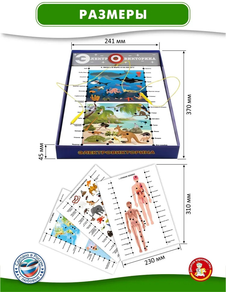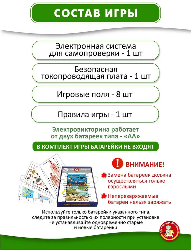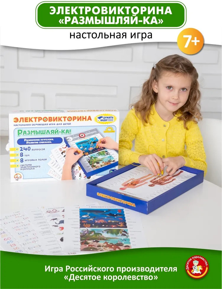 Десятое королевство Игра настольная «Электровикторина. Размышляй-ка»В данный момент этот товар отсутствует в продаже. Возможно, у нас найдется аналогичный или похожий товар здесь. Серия: Думать надо! Практикум сообразительности и логического мышления для Вашего ребёнка! В этой игре предлагается сыграть 8 тем: «Строение человека», «Карта мира», «Интересные факты», «Чудеса света», «Россия, знай наших», «Жизнь в море и на берегу», «Счёт», «Страны и символы». |