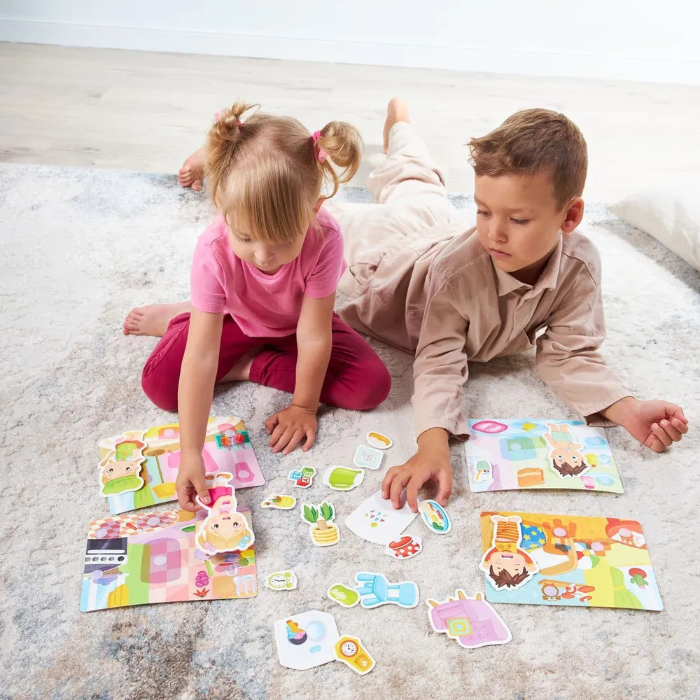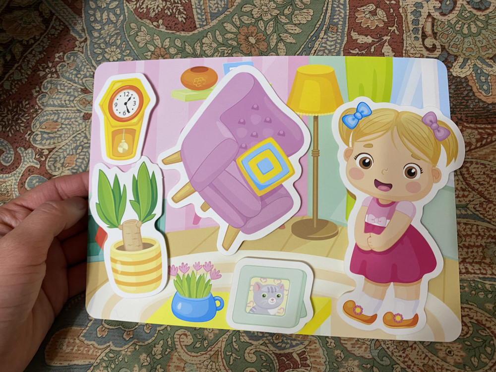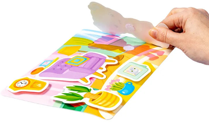 Задача малыша — понять, какие объекты крепятся к каждой карточке, а затем как можно точнее соеденить липучки «велькро», чтобы фигурка крепко держалась на картинке.