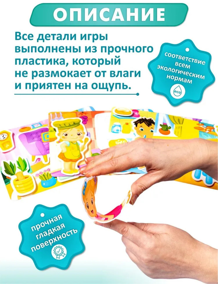 Клиенты считают, что наклейки качественные, липучки крепкие и карточки плотные. Дети с интересом играют, материалы приятны на ощупь и безопасны. Общий вывод — качественный товар, который хорошо выдерживает активное использование.