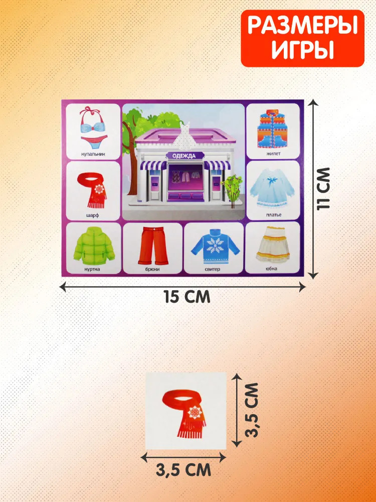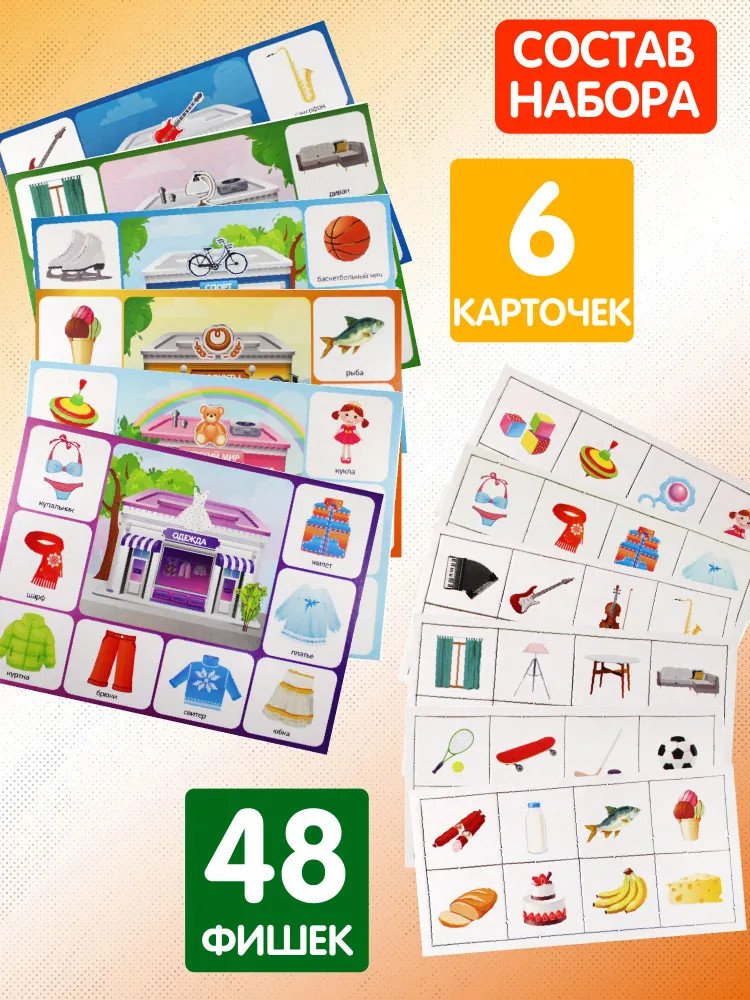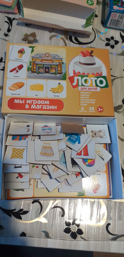 За такую цену очень классное лото! Толстый картон, размер фишек подходящий, не большой и не маленький. Карточки яркие, шесть видов: магазин игрушек, продуктов, спорттовары, муз.инструменты, одежда и дом. Поиграли с сыном. Очень понравилось!