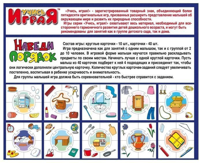 Данная игра предназначена специально для того, чтобы ребенок научился правильно раскладывать предметы по своим местам. Изучая, что и где лежит, он не только разовьет логическое мышление, память и внимательность, но также любовь к чистоте и порядку.