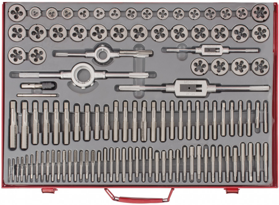 Предназначен для нарезания внутренней и внешней резьбы разного диаметра, типа и шага в сквозных и глухих отверстиях. Подходит для работы с цветными металлами и сталями, предел прочности которых составляет 800 Н/мм2 Метчики и плашки изготовлены из высококачественной легированной инструментальной стали 9ХС твердостью 59-62 HRC. На каждом изделии маркировка с указанием размера и шага резьбы. Конструкция плашки обеспечивает увеличенное количество зубьев на калибрующей части.