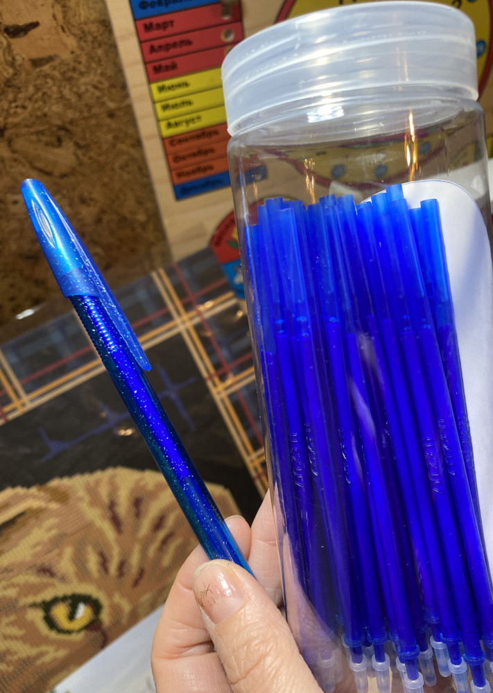 Ручка очень красивая. Сыночки сказали похожа на космос) А то что кончается - стирающиеся ручки все быстро заканчиваются. Но это не проблема, везде можно купить запасные стержни. Очень недорого купила набор 60 штук на одном из маркетплэйсов и проблем нет. Они все стандартные, подходят к любым стирающим ручкам.
