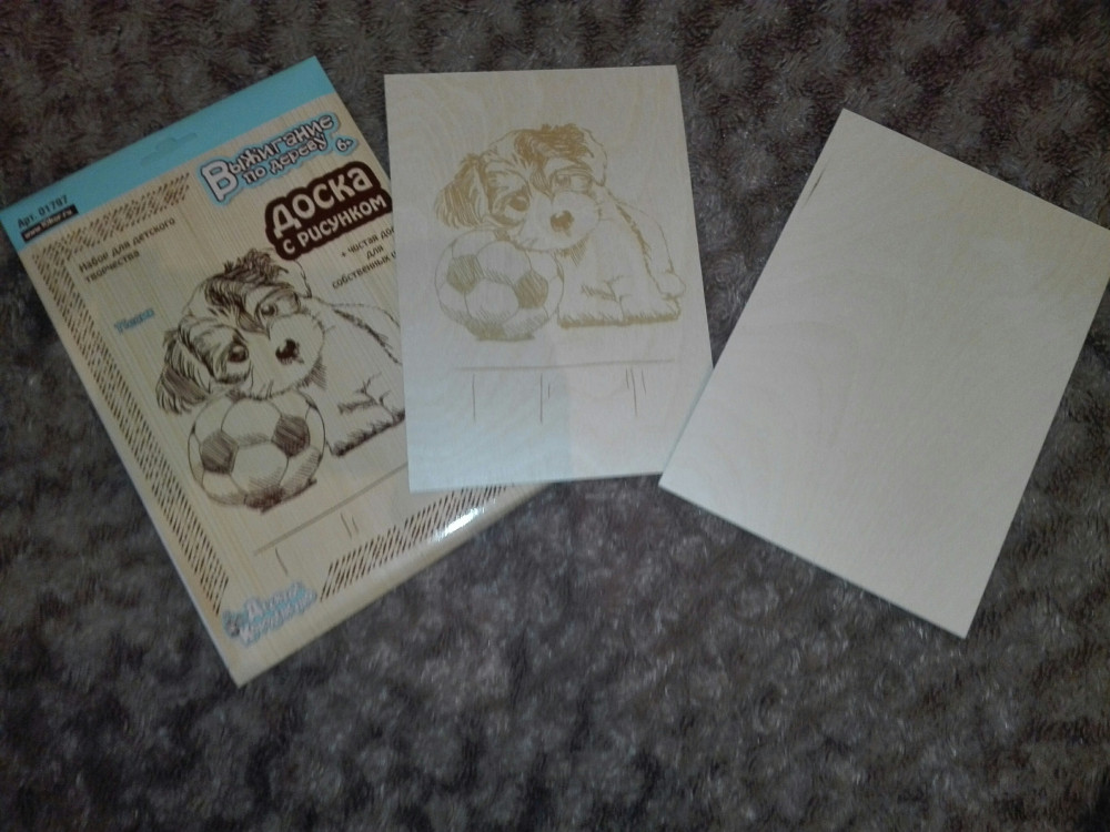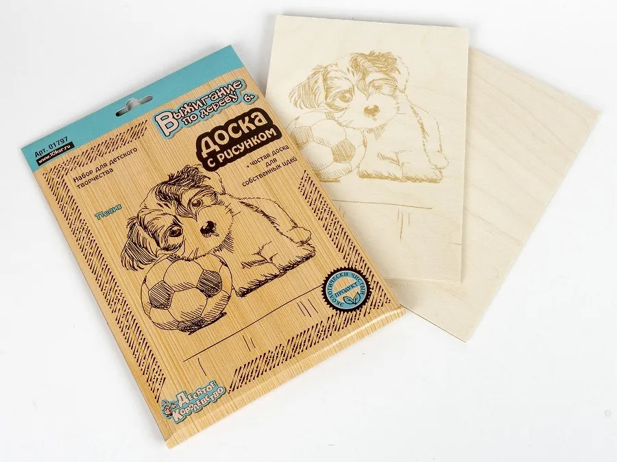 Серия: Выжигание по дереву Освоить азы пирографии можно даже не выходя из дома. Для этого вам потребуется детский набор для творчества «Песик», включающий в себя специальные доски с декоративным принтом, которые получится превратить в настоящие произведения искусства с помощью аппарата для выжигания по дереву, высокой внимательности и трудолюбия.