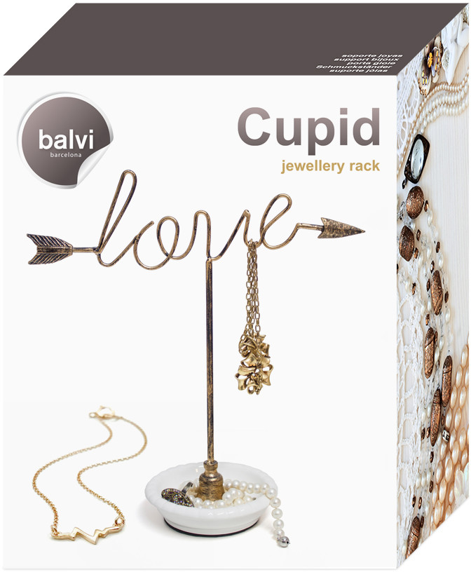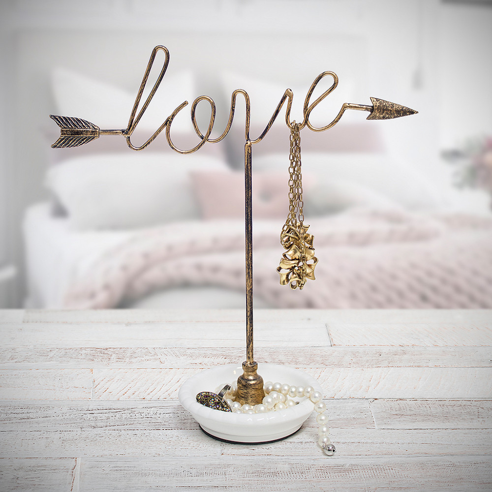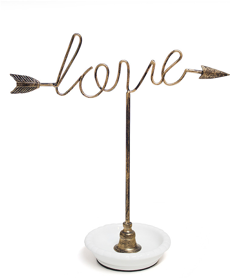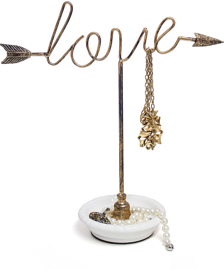 Подставка изготовлена из металла и имеет керамическое основание. Оформлен аксессуар в виде слова Любовь, пронзенного стрелой амура. Такой дизайн создает в интерьере особое настроение, а также позволяет разместить на подставке большое количество всевозможных украшений.