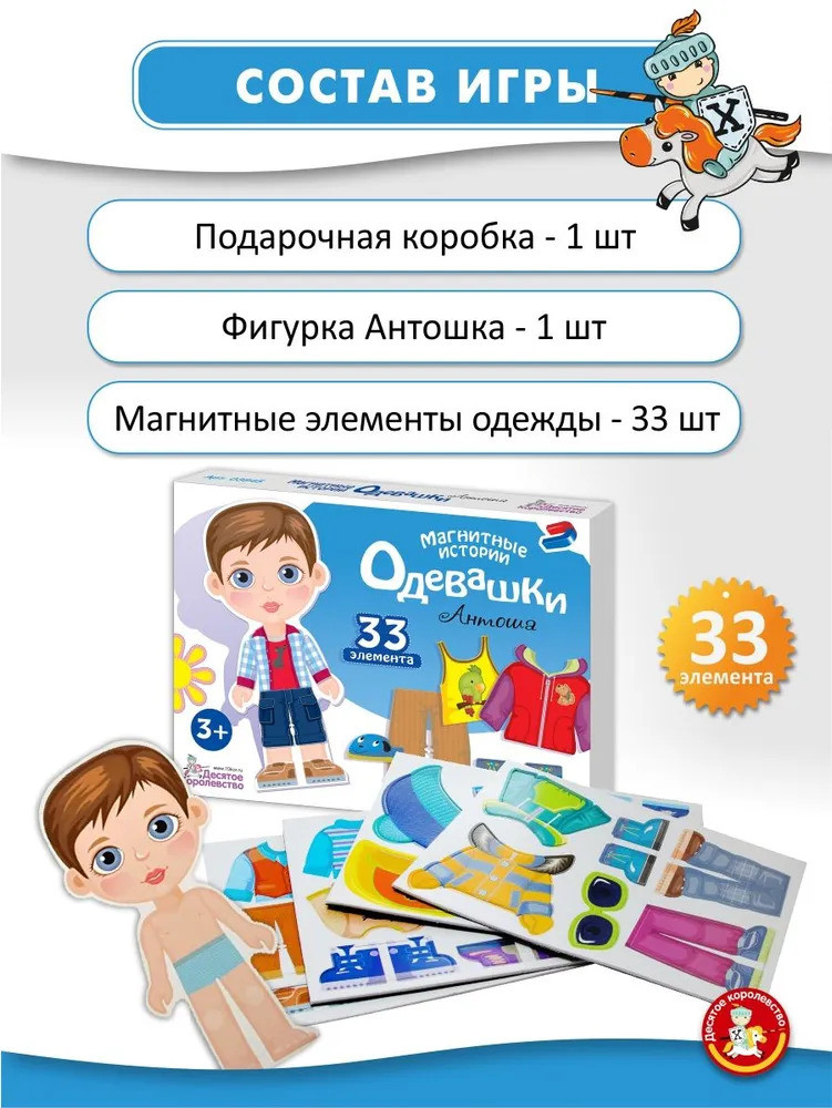 💳 Оплатить за товар можно при получении 🇰🇿 Есть бесплатная доставка по Казахстану 🎁 Копите бонусы с каждой покупки Серия: Магнитные истории Помоги Антоше подобрать наряд с новой игрой из серии «Магнитные истории»! В гардеробе этого мальчика есть сразу 33 элемента одежды, которые крепятся к нему за счет магнитного основания игровых элементов. Игра «Одевашки» развивает мелкую моторику рук, логическое мышление и эстетические представления ребенка в веселой игровой форме. |