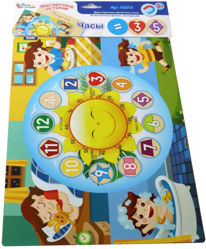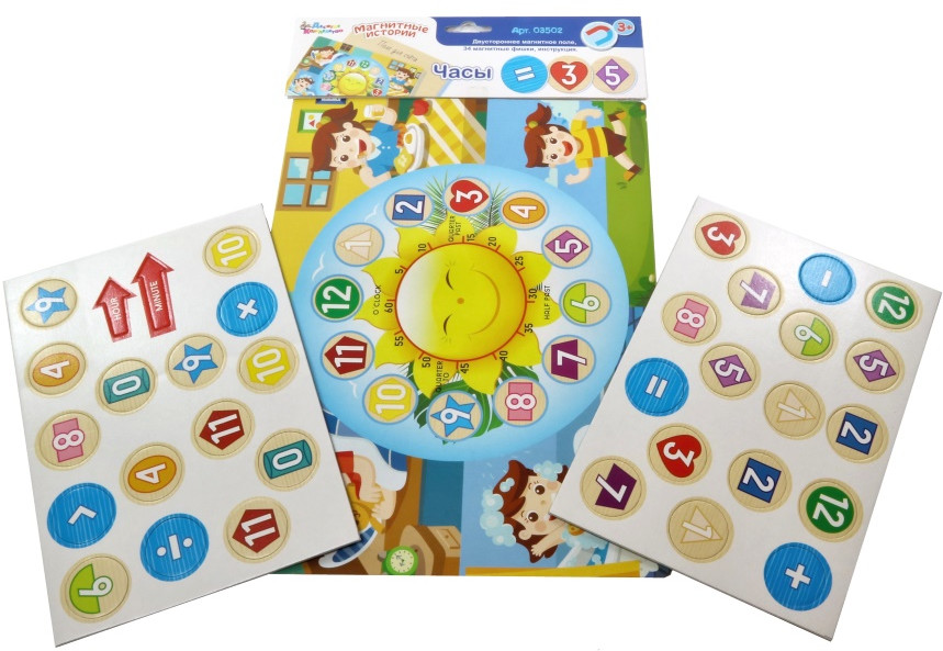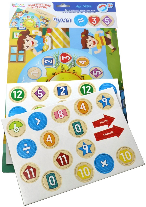• в комплекте вы найдете: двустороннее магнитное поле, 26 магнитов с цифрами и геометрическими фигурами, 2 магнитные стрелки часов, 6 магнитов в виде математических знаков, инструкцию с примерами игр;