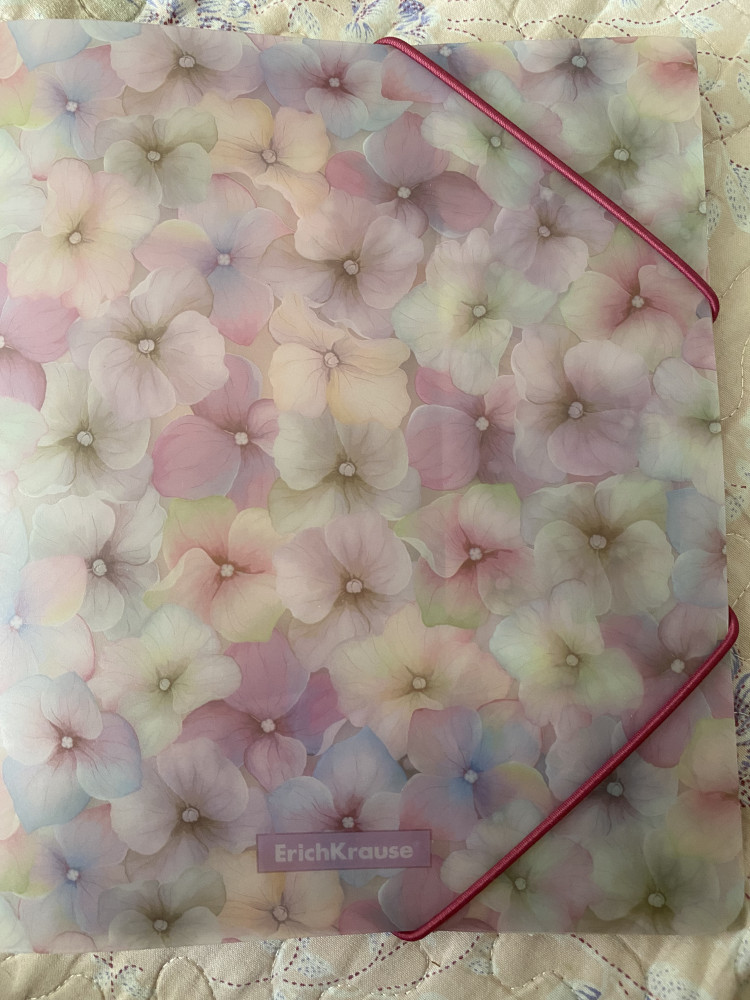 Цвет значительно бледнее, чем на фото. И сильно бледнее цвета резинок. Рисунок полупрозрачный, особенно пространство между цветочками. И смещен в желто-зеленую гамму оттенков. Но пластик ОЧЕНЬ плотный, что радует. Выполнено аккуратно. На задней стороне - стикер производителя, не пыталась его отклеивать, так что ничего не могу сказать о качестве клеевой основы.