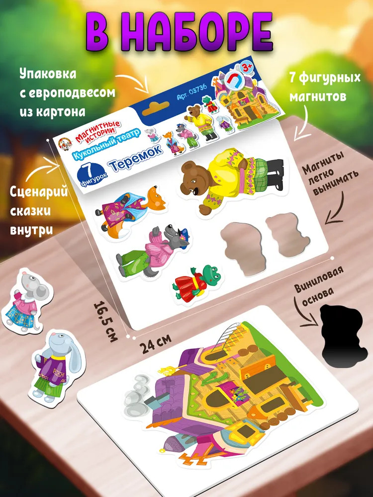 Очень хороший набор + сценарий сказки, можно играть и двигать магнитики.