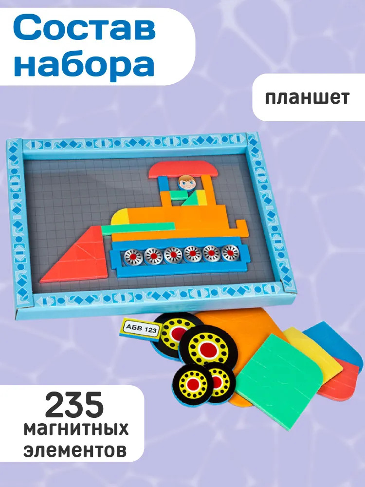 Магнитная игра выполнена качественно. Коробка большая из прочного картона. Вверху коробки - ручка, позволяющая переносить игру. Внутри коробки - магнитная доска с прочной рамкой. Фишки из магнитного мягкого полимера, расположены на пяти картах разного цвета (всего фишек получается 220). 15 дополнительных элементов - это на длинной прямоугольной полоске 4 больших колеса, 8 маленьких, 2 лица ребёнка, номер для автомобиля. (Всё, что перечислено на коробке, в наличии). Образцы для конструирования на коробке. Никакой книжечки с образцами нет. Желательно, чтобы образцы были в большем количестве. Но, тем не менее, игра отличная! -