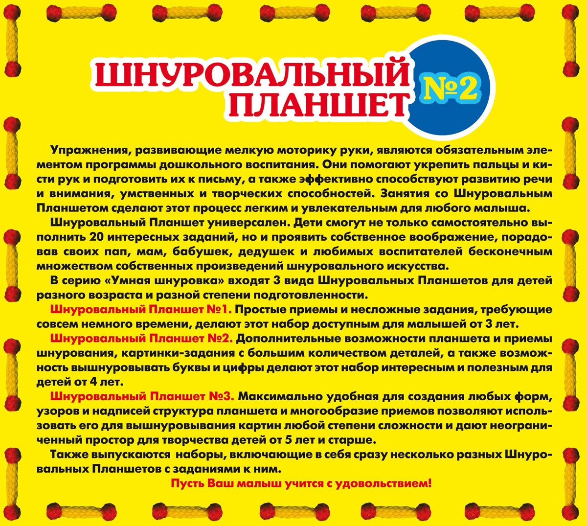 💳 Оплатить за товар можно при получении 🇰🇿 Есть бесплатная доставка по Казахстану от 1 дня 🎁 Копите бонусы с каждой покупки Регулярные занятия с универсальным шнуровальным планшетом не только тренируют пальчики, но и способствуют развитию речи и умственных способностей ребенка. С помощью разноцветных шнурков ребенок научится изображать на поверхности планшета простые контурные картинки: людей, животных, технику, архитектурные сооружения и многое другое. В цветной книжке-подсказке, входящей в состав набора, приведены приемы шнурования и большой выбор готовых картинок, которые можно скопировать на планшет. Сам планшет выполнен из качественной пластмассы, а шнурки имеют твердые пластиковые наконечники, препятствующие разлохмачиванию кончиков шнурков. |
