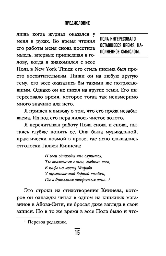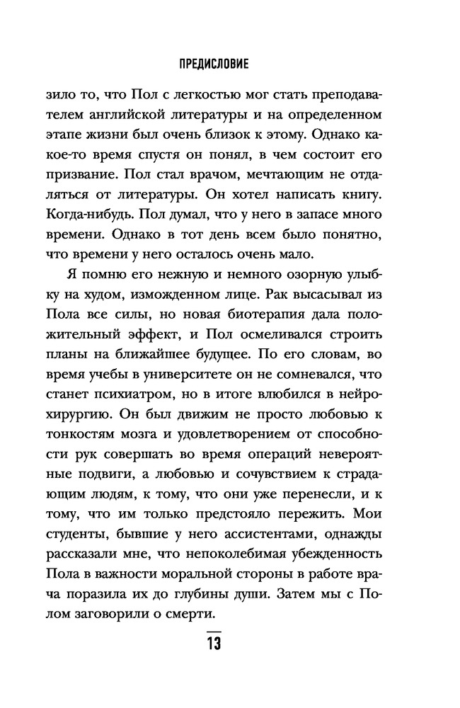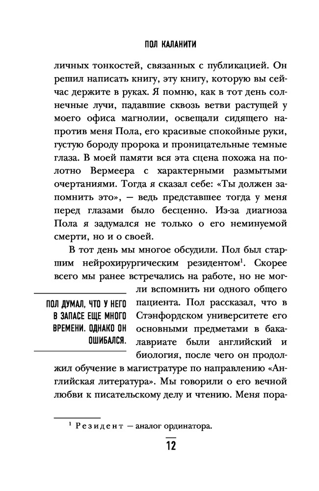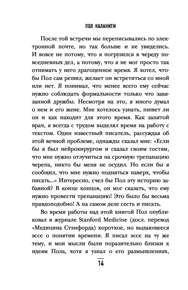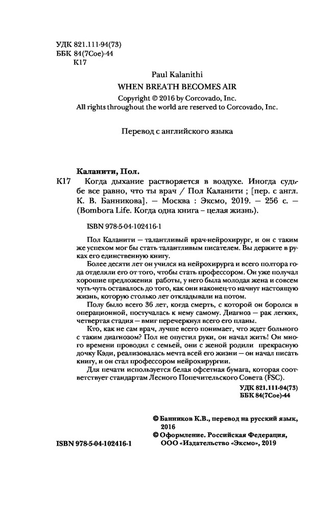 Когда дыхание растворяется в воздухе. Иногда судьбе все равно, что ты врачВ данный момент этот товар отсутствует в продаже. Возможно, у нас найдется аналогичный или похожий товар здесь. Серия: Bombora Life. Когда одна книга – целая жизнь Пол Каланити — талантливый врач-нейрохирург, и он с таким же успехом мог бы стать талантливым писателем. Вы держите в руках его единственную книгу. Более десяти лет он учился на нейрохирурга и всего полтора года отделяли его от того, чтобы стать профессором. Он уже получал хорошие предложения работы, у него была молодая жена и совсем чуть-чуть оставалось до того, как они наконец-то начнут настоящую жизнь, которую столько лет откладывали на потом. Полу было всего 36 лет, когда смерть, с которой он боролся в операционной, постучалась к нему самому. Диагноз — рак легких, четвертая стадия — вмиг перечеркнул всего его планы. Кто, как не сам врач, лучше всего понимает, что ждет больного с таким диагнозом? Пол не опустил руки, он начал жить! Он много времени проводил с семьей, они с женой родили прекрасную дочку Кэди, реализовалась мечта всей его жизни — он начал писать книгу, и он стал профессором нейрохирургии. |