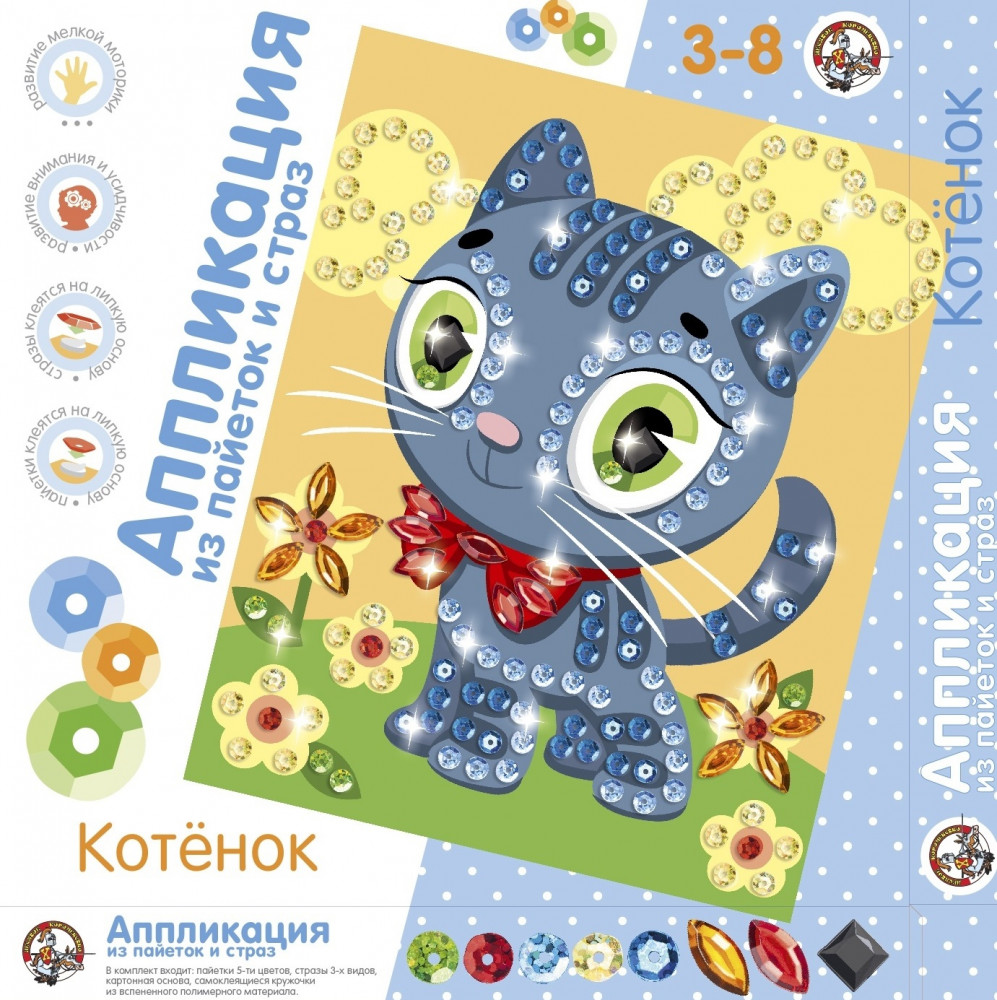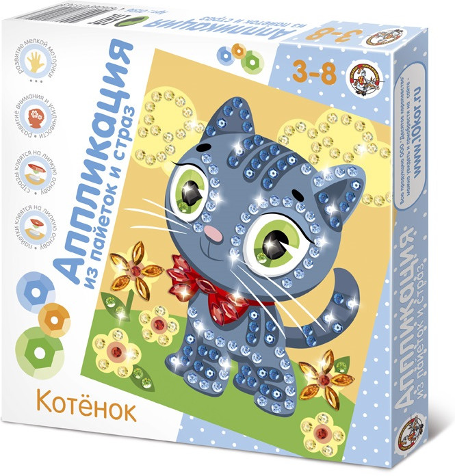 Аппликация является популярным и эффективным украшением любого рисунка, и является, обычно завершающим элементом в создании шедевра. Набор с паетками и стразами уже содержит готовое изображение котенка, остается только украсить его разноцветными сверкающими деталями и отличный подарок или картина на стену — готова! Начать занятия с любимым детским творчеством, особенно у девочек, можно с детьми от 3-х лет. Набор отлично развивает мелкую моторику пальчиков и прививает тягу к творчеству.
