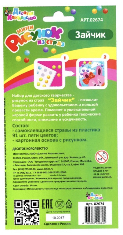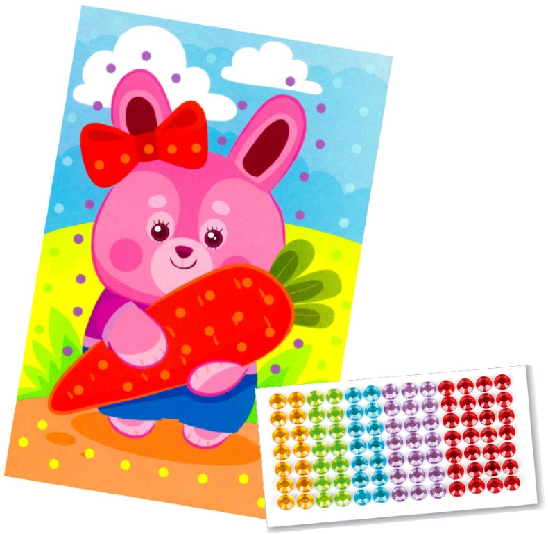 Набор для детского творчества мини-рисунок из страз «Зайчик» позволит Вашему ребенку с удовольствием и пользой провести время. Поможет в увлекательной игровой форме развить у ребенка творческие способности, внимание и усидчивость. Игра рекомендована для детей от трех лет. Задача ребенка — украсить рисунок стразами. Для того, чтобы наклеить стразы на картинку необходимо отделить стразы нужного цвета от блока и наклеить его на картинку, плотно прижав, к точкам, соответствующего цвета.