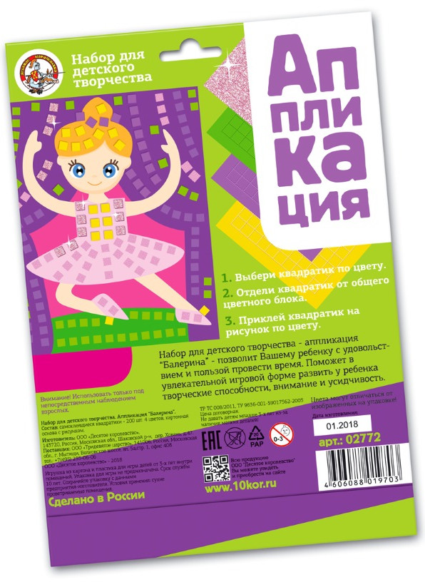 💳 Оплатить за товар можно при получении 🇰🇿 Есть бесплатная доставка по Казахстану от 1 дня 🎁 Копите бонусы с каждой покупки Аппликация «Балерина» — набор для творчества для детей от 3-х лет. Украшайте картинку самоклеящимися квадратиками, развивайте моторику пальчиков и стимулируйте творческие способности ребёнка. Подберите квадратик по цвету. Отделите самоклеящейся квадратик от блока. Приклейте квадратик на картонную основу, на соответствующее его цвету место. Внимание! Контроль взрослого во время работы с аппликацией обязателен — набор содержит мелкие детали. |