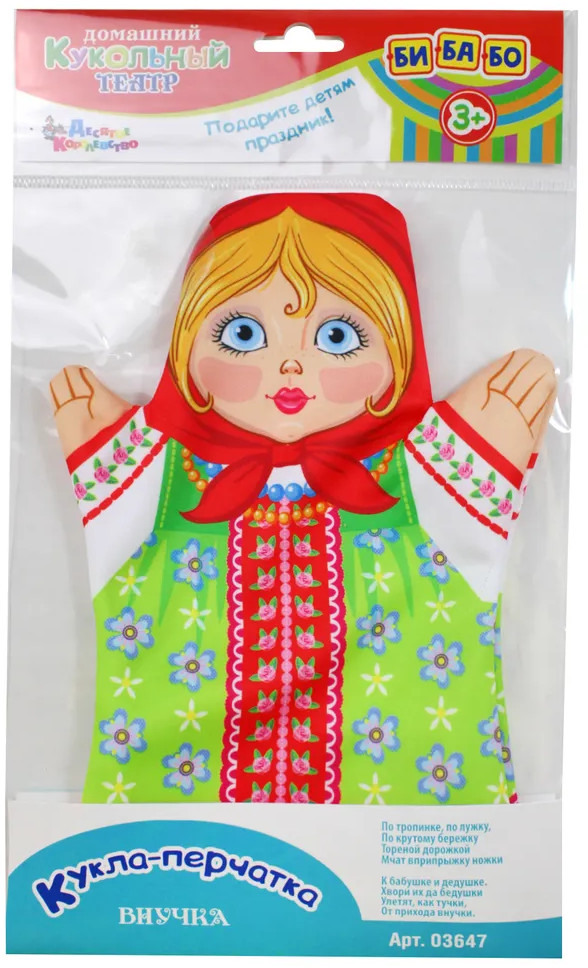 Десятое королевство Кукла перчатка «Внучка»В данный момент этот товар отсутствует в продаже. Возможно, у нас найдется аналогичный или похожий товар здесь. Серия: Би-Ба-Бо Кукла перчатка «Внучка» входит в состав кукольных театров, выпускаемых «Десятым королевством» — «Курочка Ряба», «Репка», «Битый небитого везет» и «Колобок». Эту игрушку можно использовать при создании своего кукольного представления — Машенька и медведь, Как лиса волка судила, Страшный Пых, Волчья песня, Соломенный бычок. |