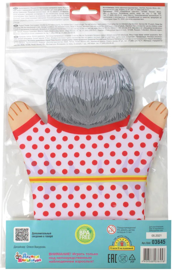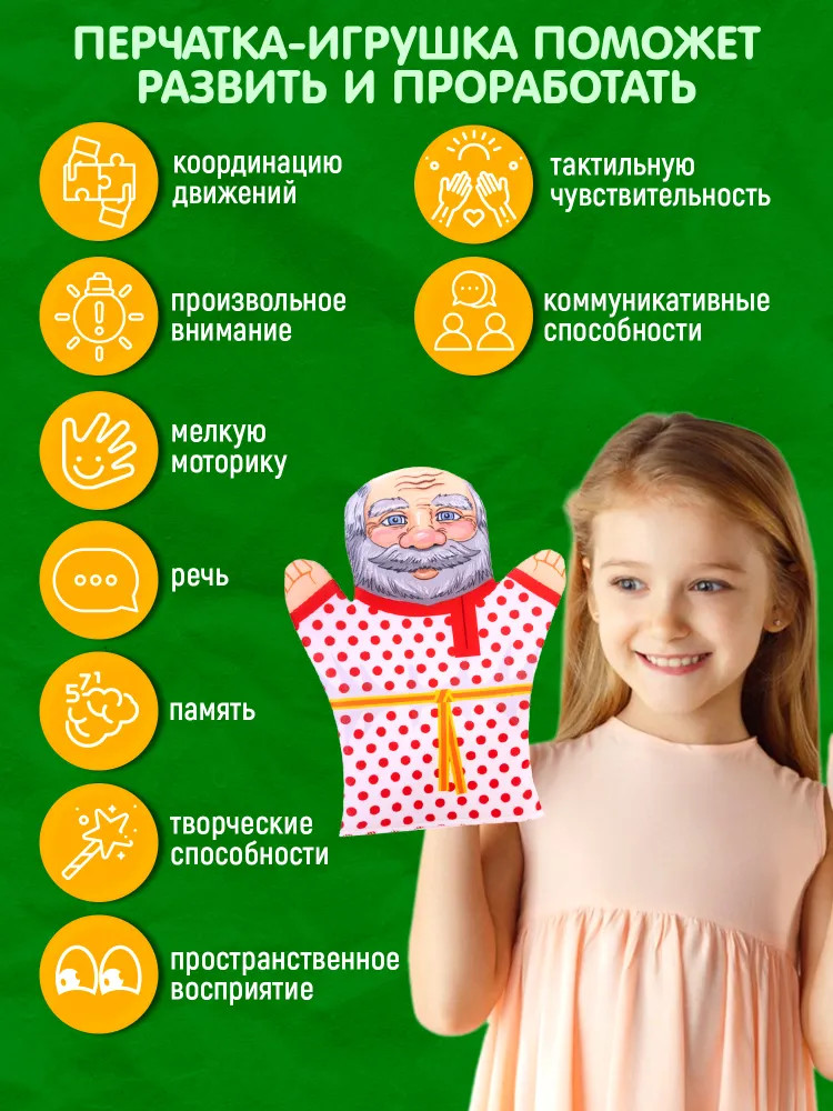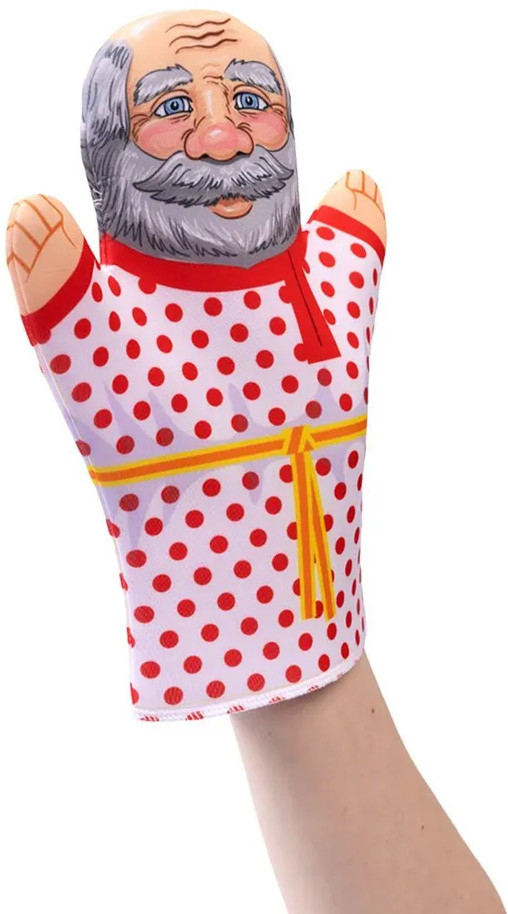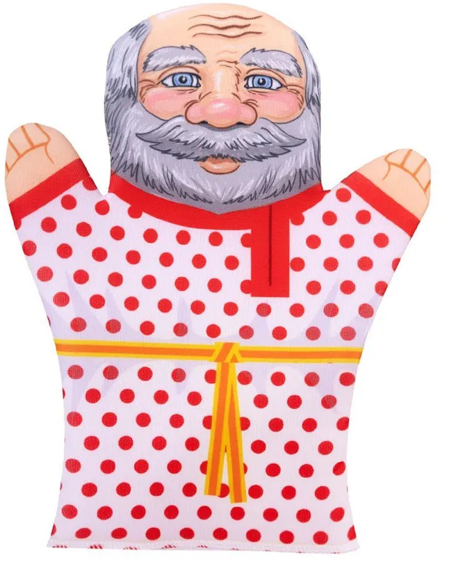 Игрушка-перчатка изготовлена полностью из стойкого материала и соответствуют всем требованиям безопасности, не содержит вредных для здоровья веществ. «Дедушка» изготовлена на оборудовании, позволяющем передать самые мелкие детали.
