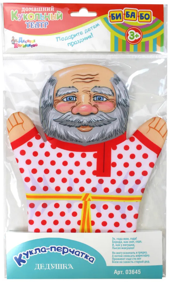 Кукла перчатка «Дедушка» входит в состав кукольных театров, выпускаемых «Десятым королевством» — «Курочка Ряба», «Репка», «Битый небитого везет» и «Колобок». Эту игрушку можно использовать при создании своего кукольного представления — Машенька и медведь, Как лиса волка судила, Страшный Пых, Кот и лиса, Вершки и корешки, Волчья песня, Соломенный бычок .
