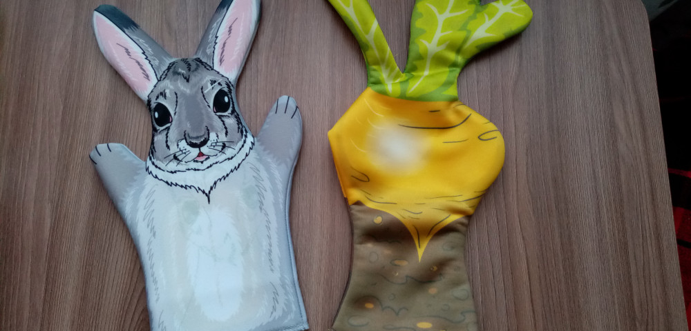 Немножко не повезло именно с Зайцем. Такой получился Заяц-бандит с рассеченой бровью ( белый шрамик на брови) да в придачу съел ежа ( под рисунком зайца просвечивает еж) Сама перчатка плотная, печать яркая, швы хорошо обработаны.