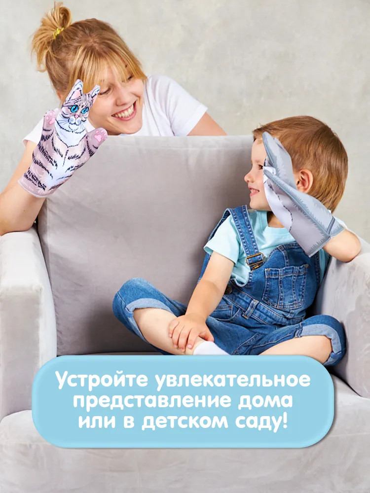 Кукла-перчатка соответствует своему фото. Ребёнок сразу обратил на неё внимание: красочная кошка. Посмотрим, насколько долговечна.