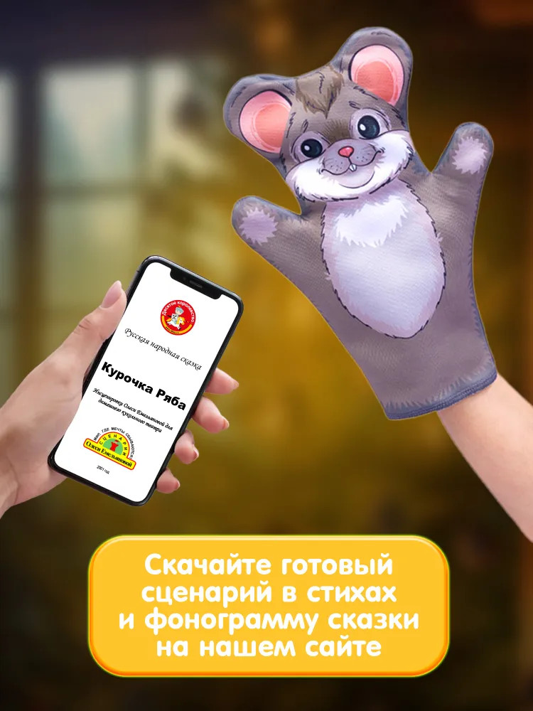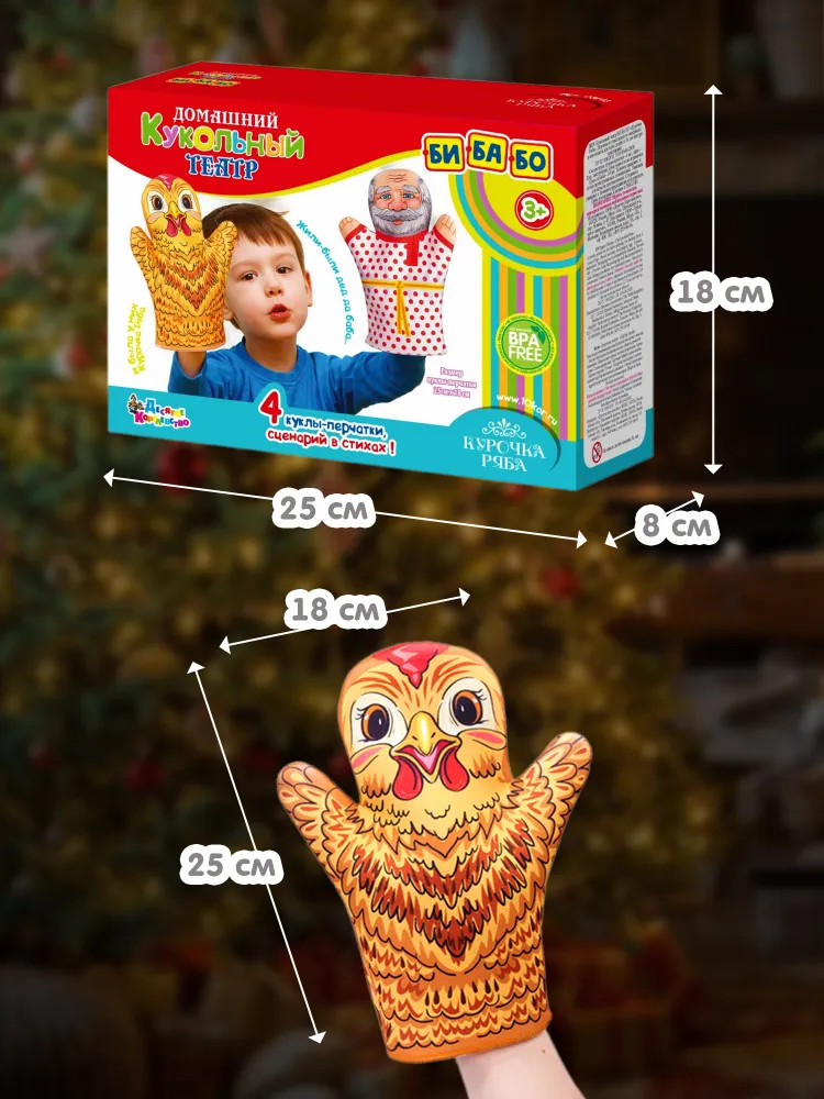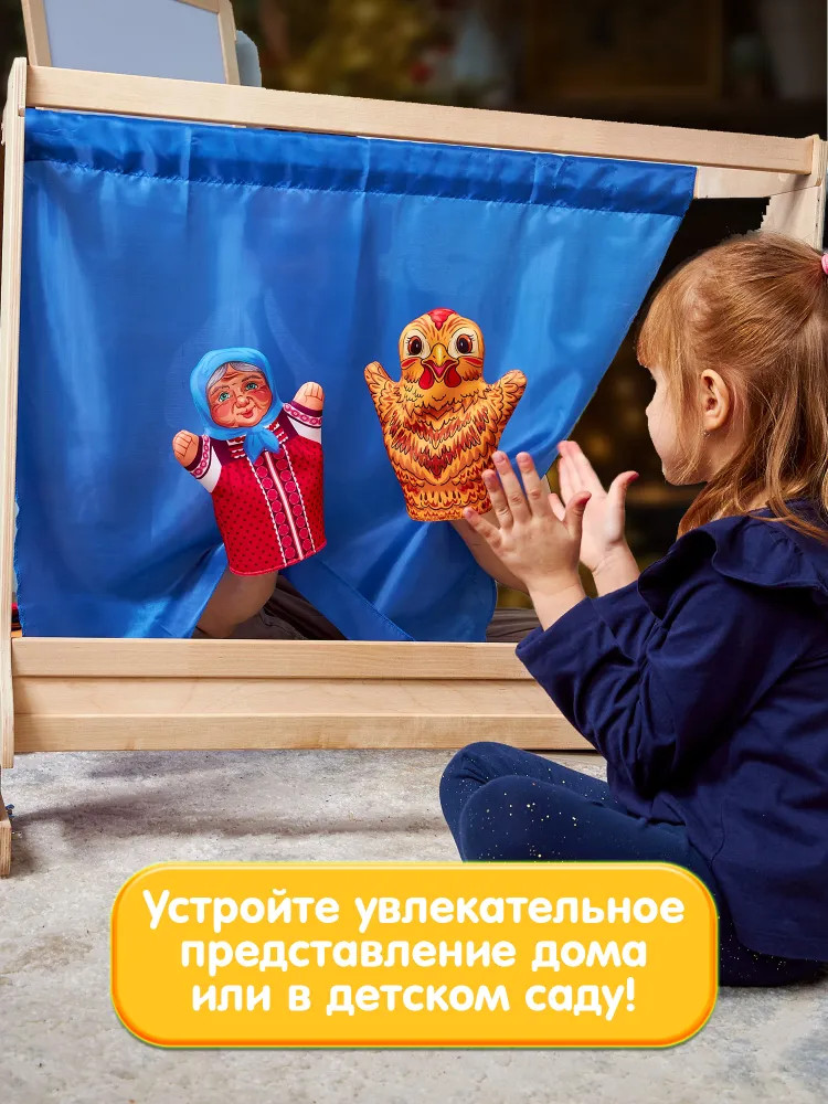 • количество кукол: 4 (дед, бабка, курочка Ряба и мышка) размером — 25 × 18 см;