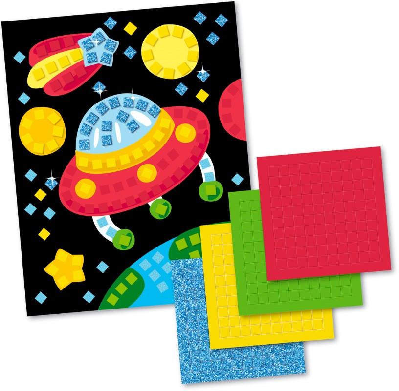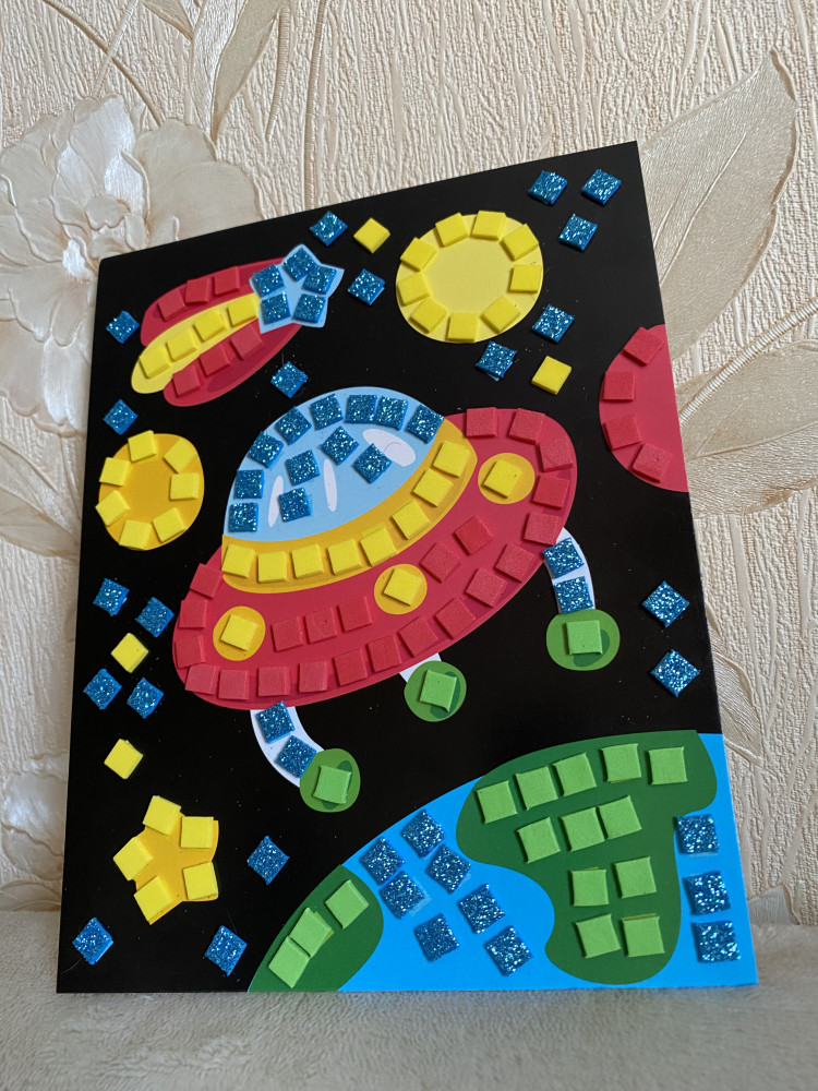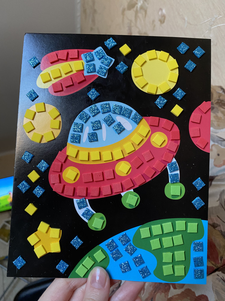 Замечательная мозаика. Нужно квадратики не просто наклеить, а еще повернуть под нужным углом. Это неплохая тренировка для 2,5-3 летнего ребенка. Правда, голубые квадратиками с блестками и те, как водится, осыпаются и к рукам липнут