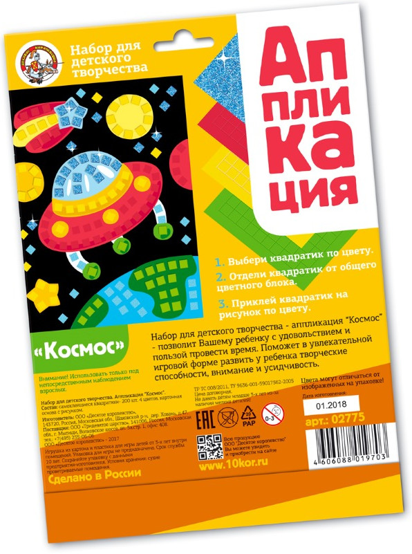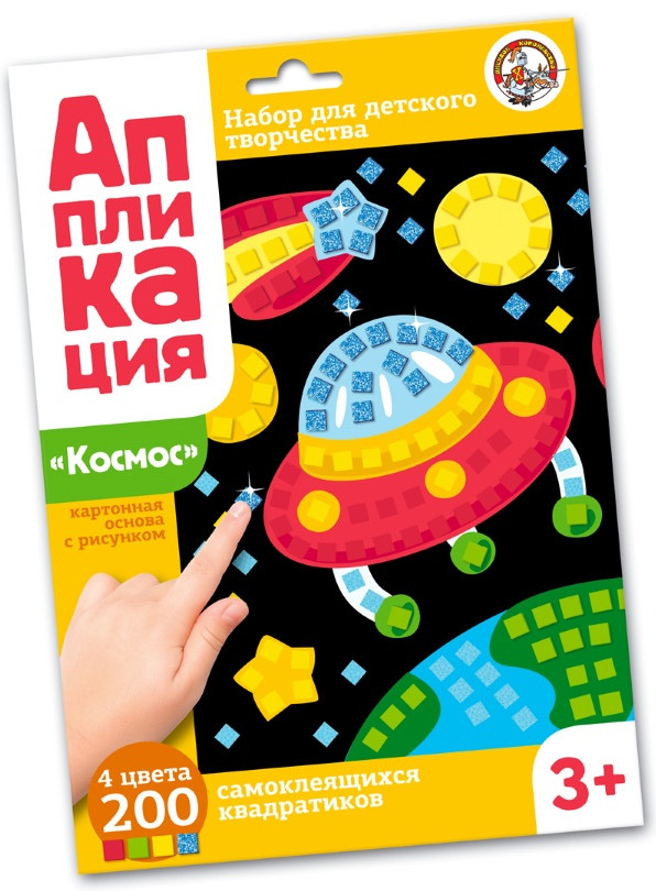 Десятое королевство Аппликация «Космос»В данный момент этот товар отсутствует в продаже. Возможно, у нас найдется аналогичный или похожий товар здесь. Аппликация «Космос» — набор для творчества для детей от 3-х лет. Украшайте картинку самоклеящимися квадратиками, развивайте моторику пальчиков и стимулируйте творческие способности ребёнка. Подберите квадратик по цвету. Отделите самоклеящейся квадратик от блока. Приклейте квадратик на картонную основу, на соответствующее его цвету место. Внимание! Контроль взрослого во время работы с аппликацией обязателен — набор содержит мелкие детали. |