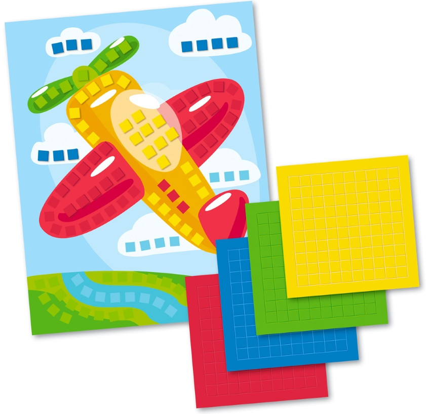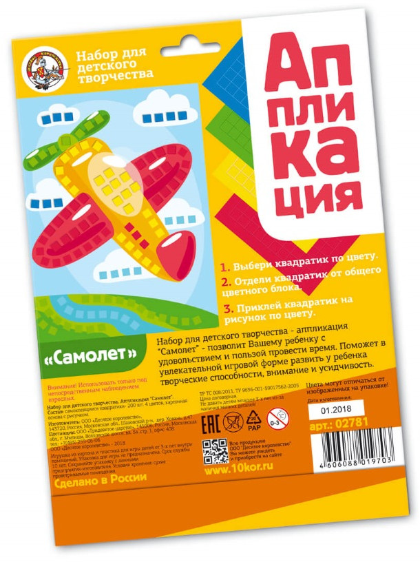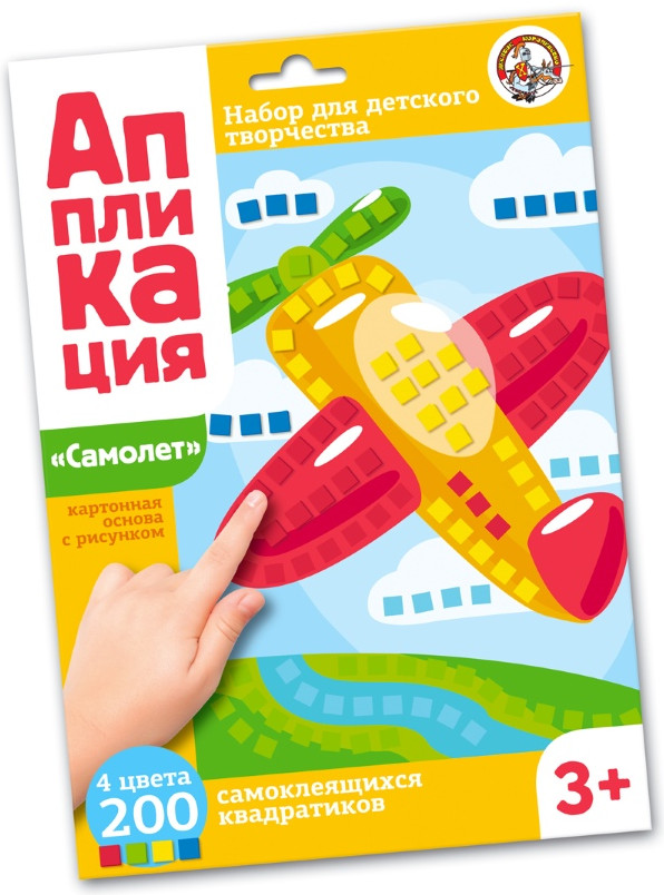 Аппликация «Самолет» — набор для творчества для детей от 3-х лет. Украшайте картинку самоклеящимися квадратиками, развивайте моторику пальчиков и стимулируйте творческие способности ребёнка. Подберите квадратик по цвету. Отделите самоклеящейся квадратик от блока. Приклейте квадратик на картонную основу, на соответствующее его цвету место. Внимание! Контроль взрослого во время работы с аппликацией обязателен — набор содержит мелкие детали.