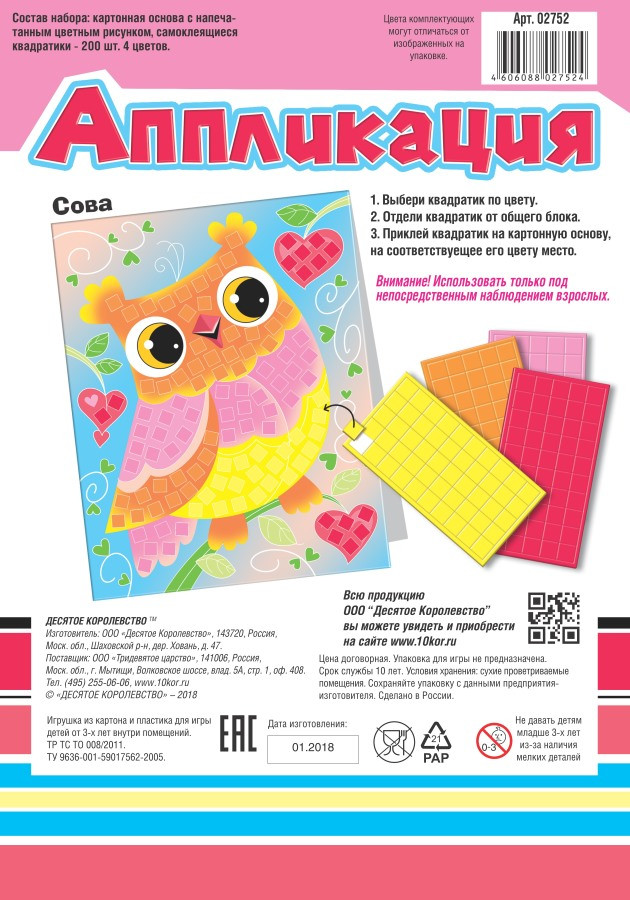 💳 Оплатить за товар можно при получении 🇰🇿 Есть бесплатная доставка по Казахстану от 1 дня 🎁 Копите бонусы с каждой покупки Аппликация «Сова» — набор для творчества для детей от 3-х лет. Украшайте картинку самоклеящимися квадратиками, развивайте моторику пальчиков и стимулируйте творческие способности ребёнка. Подберите квадратик по цвету. Отделите самоклеящейся квадратик от блока. Приклейте квадратик на картонную основу, на соответствующее его цвету место. Внимание! Контроль взрослого во время работы с аппликацией обязателен — набор содержит мелкие детали. |