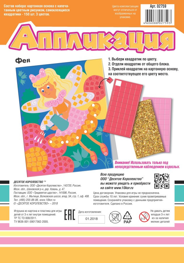 💳 Оплатить за товар можно при получении 🇰🇿 Есть бесплатная доставка по Казахстану от 1 дня 🎁 Копите бонусы с каждой покупки Аппликация «Фея» — набор для творчества для детей от 3-х лет. Украшайте картинку самоклеящимися квадратиками, развивайте моторику пальчиков и стимулируйте творческие способности ребёнка. Подберите квадратик по цвету. Отделите самоклеящейся квадратик от блока. Приклейте квадратик на картонную основу, на соответствующее его цвету место. Внимание! Контроль взрослого во время работы с аппликацией обязателен — набор содержит мелкие детали. |