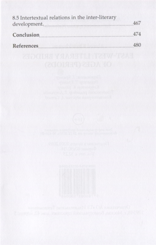 East-west: literary bridges of ages (periods)В данный момент этот товар отсутствует в продаже. Возможно, у нас найдется аналогичный или похожий товар здесь. Серия: Библиотека премии Набокова В монографии доктора филологических наук, профессора Чеченского государственного университета Ахмеда Хусиханова представлена эволюция литературных взаимоотношений России со странами Западной Европы, начиная с эпохи Древней Руси и заканчивая XX веком. Основные главы исследования посвящены литературным России с такими ведущими странами Запада, как Англия, Франция и Германия. Отдельная глава посвящена переводу как форме межлитературных связей. Анализируются проблемы перевода художественного наследия русских классиков (Ф.М. Достоевский, М.Е. Салтыков-Щедрин, Л.Н. Толстой) на английский, немецкий и французский языки и его восприятие западным читателем. |