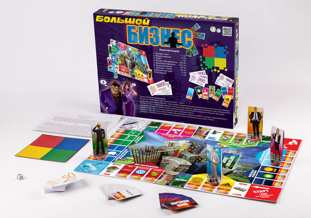 Комплектация: игровое поле, фишки игроков, фишки собственности, денежные банкноты, акции филиалов, карточки «Шанс», правила игры.