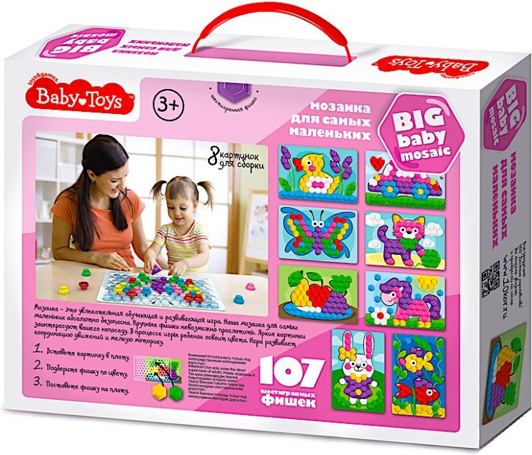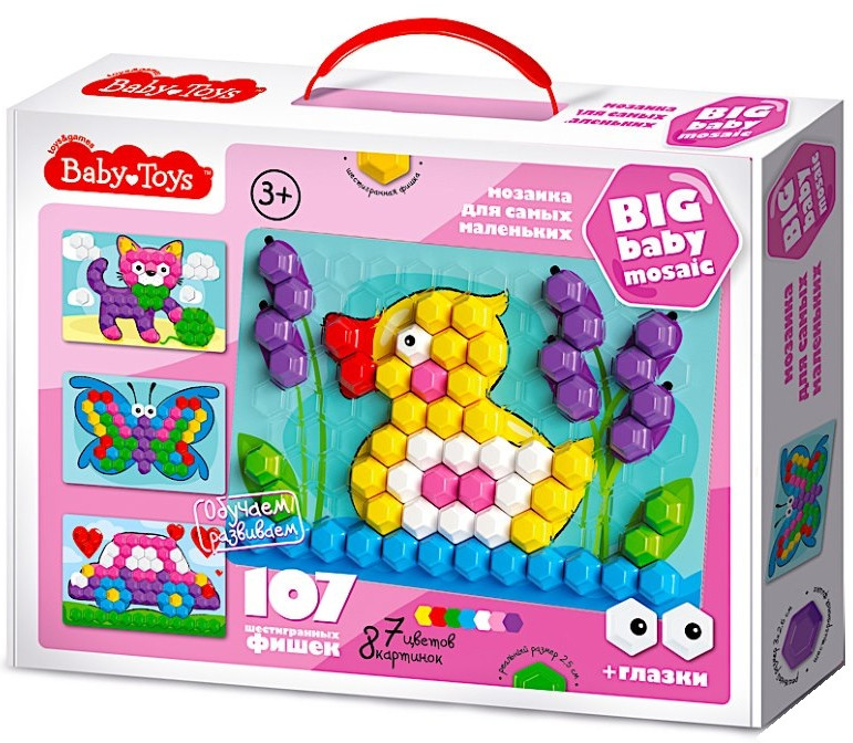 Мозаика из 107 элементов, семи цветов серии Baby Toys — это увлекательная обучающая и развивающая игра для самых маленьких. Абсолютно безопасна для детей, крупные шестигранные фишки размером 25 миллиметров невозможно проглотить. Яркие картинки заинтересуют вашего непоседу. В процессе игры ребенок освоит цвета, разовьет координацию движений и мелкую моторику. Мозаика рассчитана на детей начиная с 3 летнего возраста.