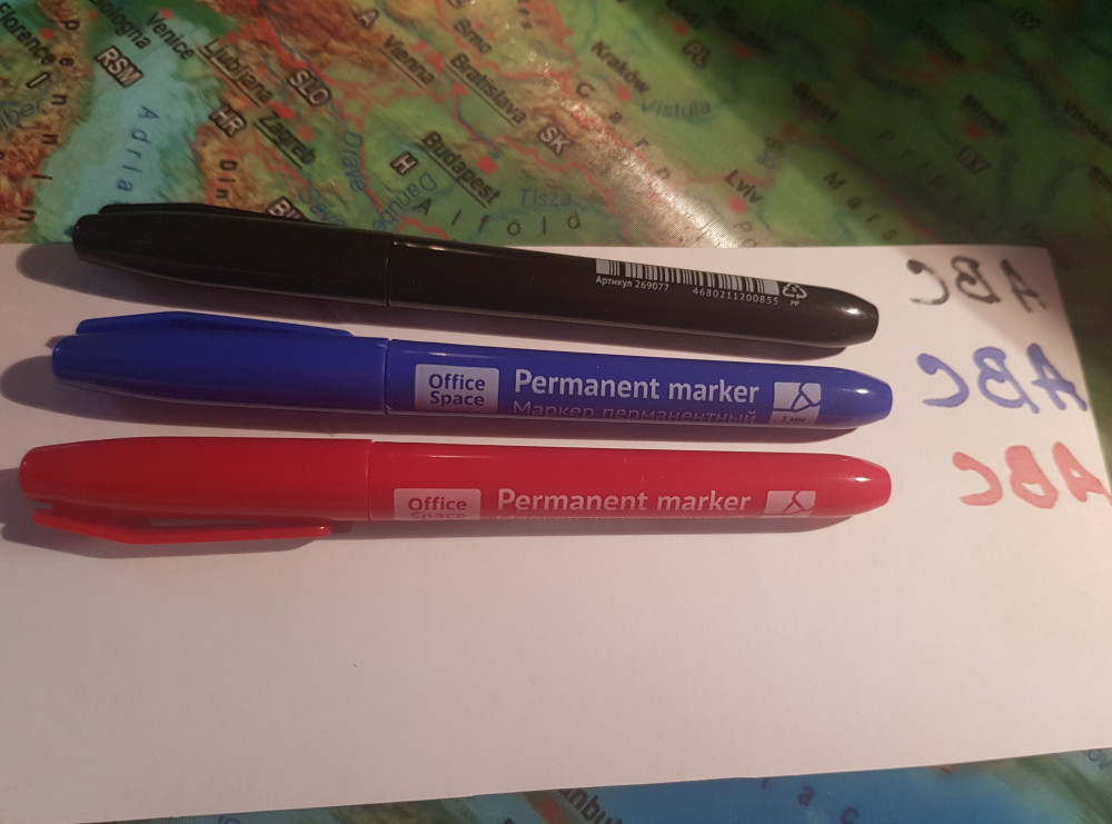 Качество не понравилось, не 1 мм синий и красный, для бумаги (картона) люб.плотности не подойдет, норм писать по скотчу, пластику и металлу крупным шрифтом.