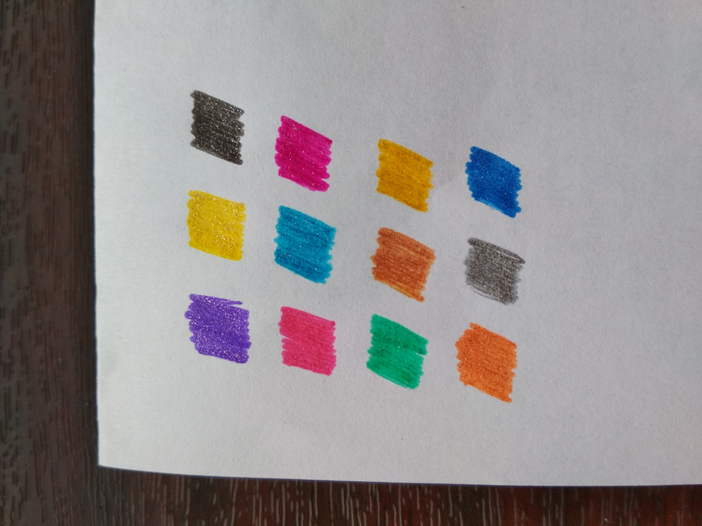 Яркие цвета. Блестит равномерно. Некоторые правда, будто царапают бумагу, но это не критично.