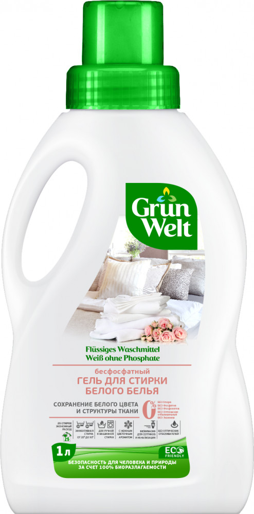 Гель для стирки белого белья «GrunWelt» способствует сохранению белого цвета и структуры ткани. Не содержит оптических отбеливателей. Гель предотвращает появление серого оттенка, придает вещам ненавязчивый тонкий цветочный аромат. Не содержит флуоресцентные вещества. Отлично выполаскивается.