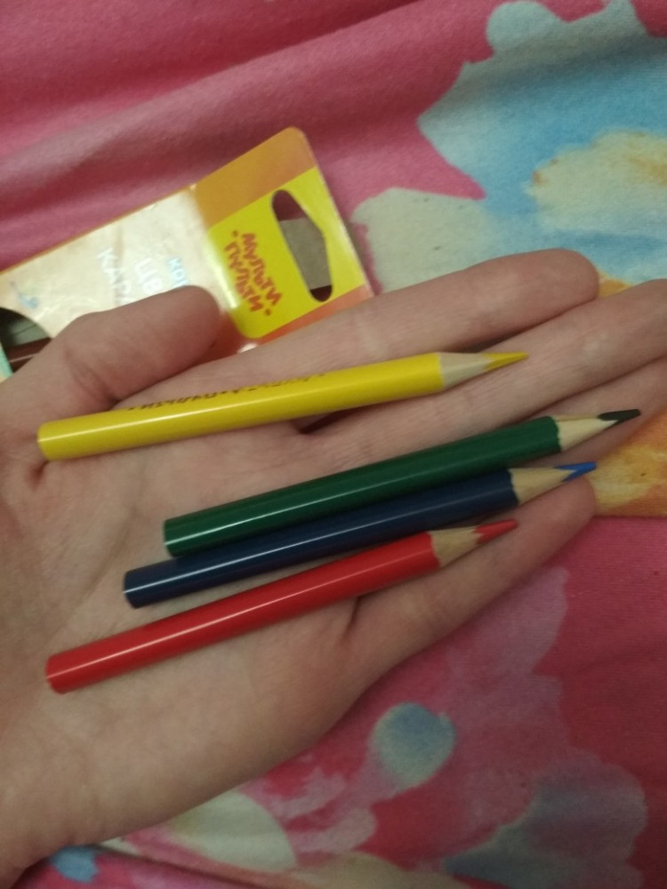 Сын, 3 года, держал карандаши стандартного размера практически на середине и выше, поэтому купила короткие, теперь проблем нет 👍🏻 очень яркие и мягкие, не крошатся