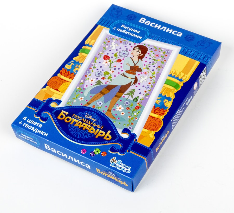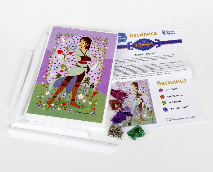 Набор для творчества большой рисунок с пайетками «Последний Богатырь. Василиса» изготовлен по лицензии «Уолт Дисней», рассчитан прежде всего на девочек старше 7 лет, которые хотят и любят создавать своими руками красочные сверкающие шедевры. Простое, но творческое и увлекательное занятие поможет в игровой форме развить у ребенка творческие способности, внимание и усидчивость. Рисунок в рамке, украшенный пайетками, будет достойно смотреться в любом месте.