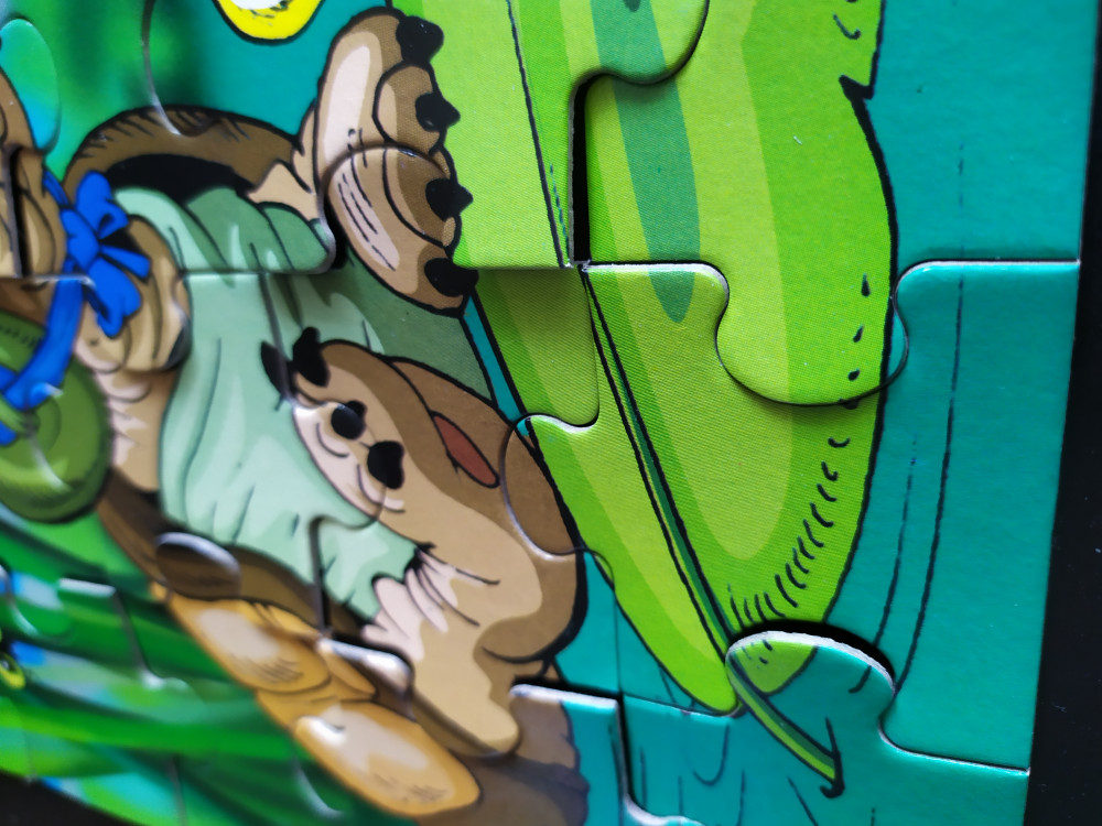 Пазл яркий, соответствует картинке, но соединительные элементы почти все слегка кривые, поэтому ровно не прилегают друг другу, это немного портит впечатление.