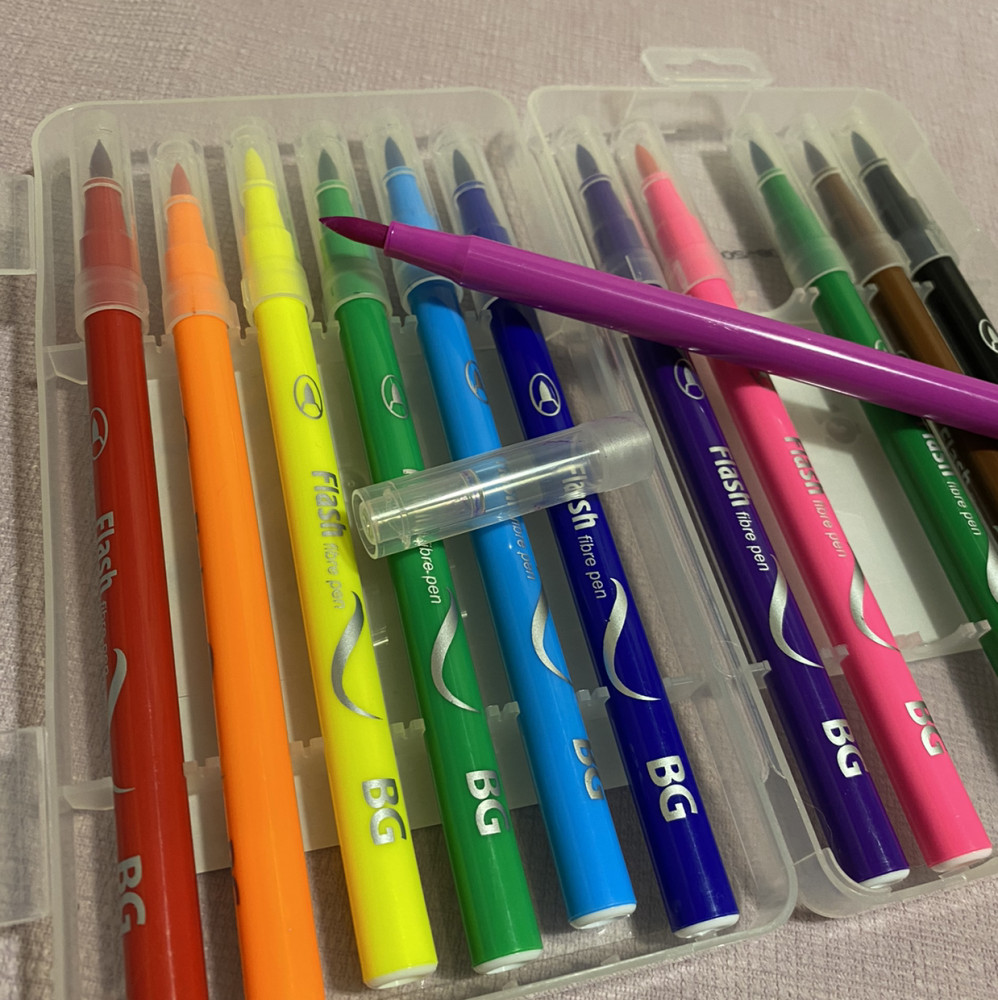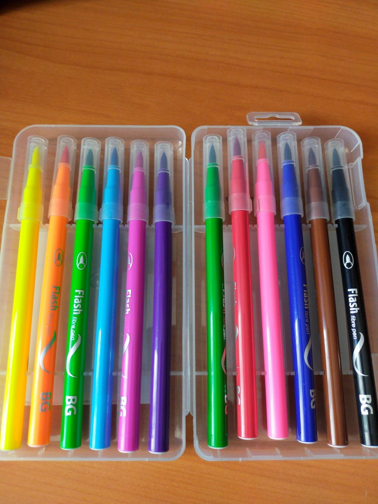 Хорошие фломастеры, очень удобно для школы. Не теряются, так как лежат в коробочке на своих местах. Цвета сочные, стержень конусовидный, похож на кисть, детям понравились.