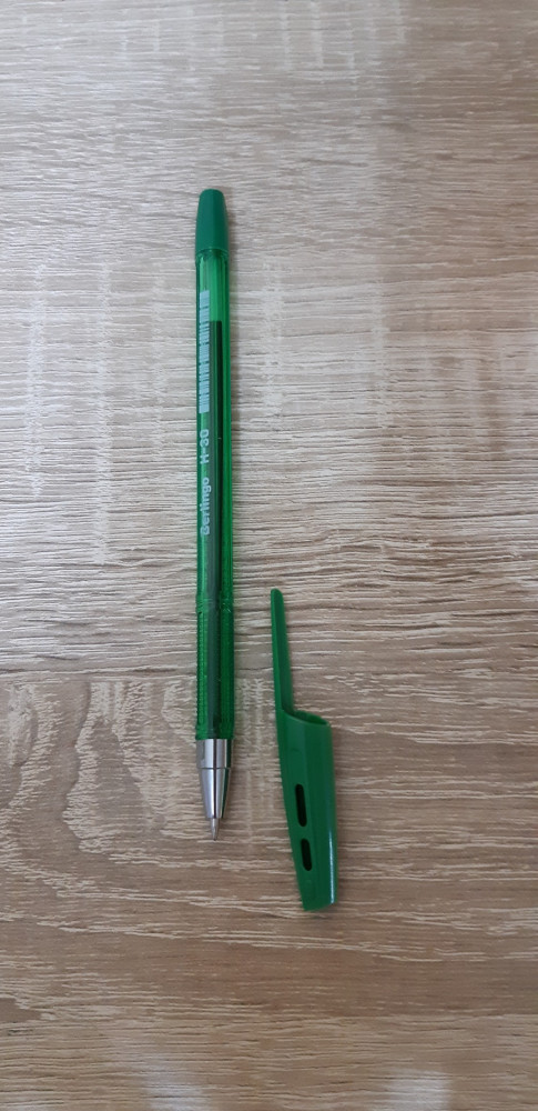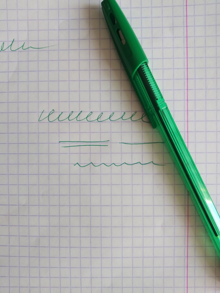 Обычная зеленая ручка. Пишет тонко. Для школьника нормально.