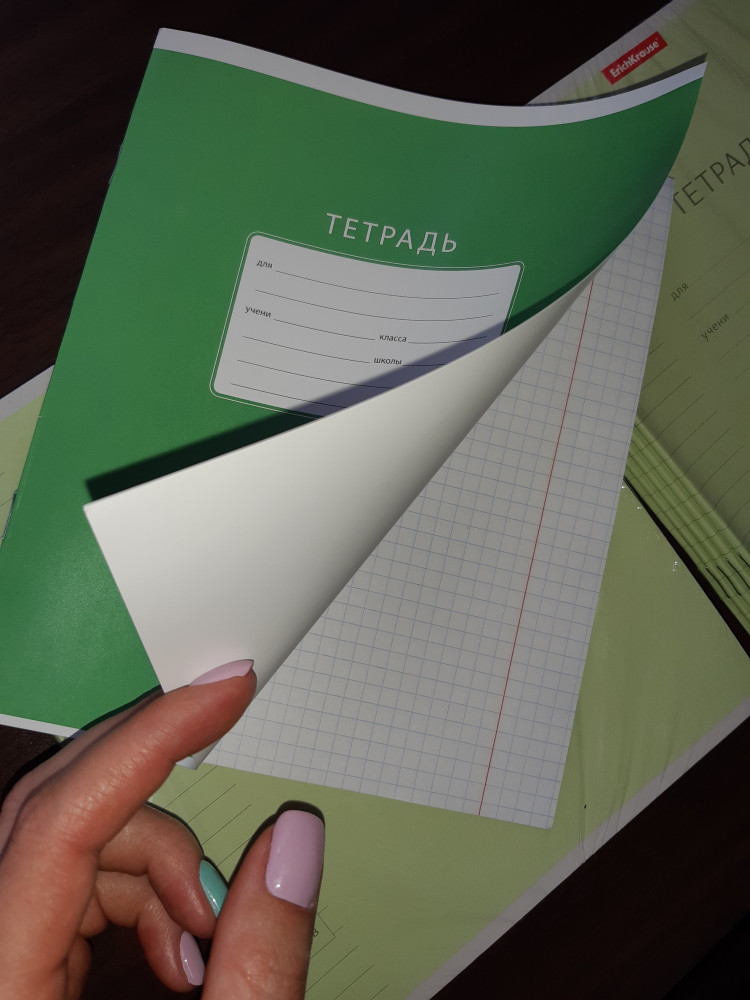 Тетрадки хорошие, листы белые, обложка приятного цвета, но ожидала более плотной обложки. Она, как и указано, сделана из мелонового картона, но такой тоненький, по сравнению с тетрадками Erich Krause. Такой тонкий, что даже мнётся. А цена у этих выше. А за доставку все 5 звёзд!