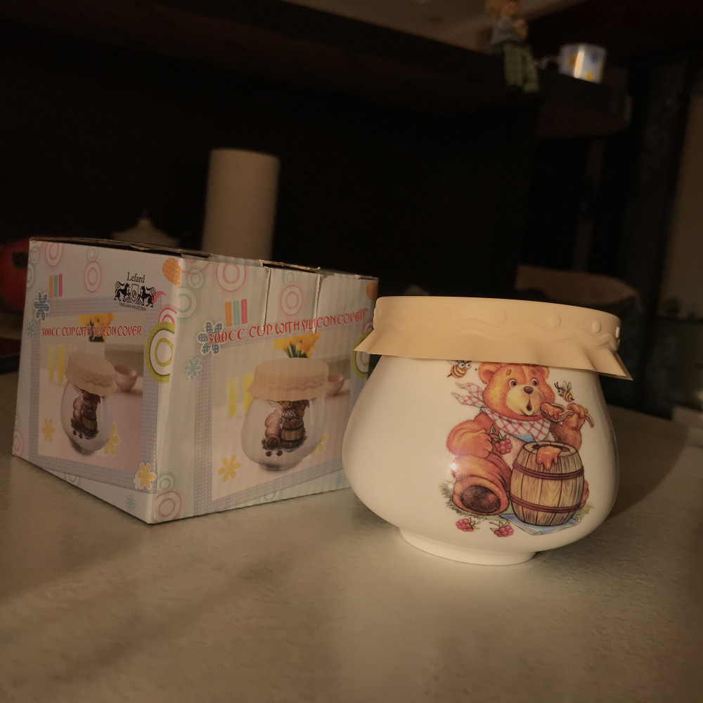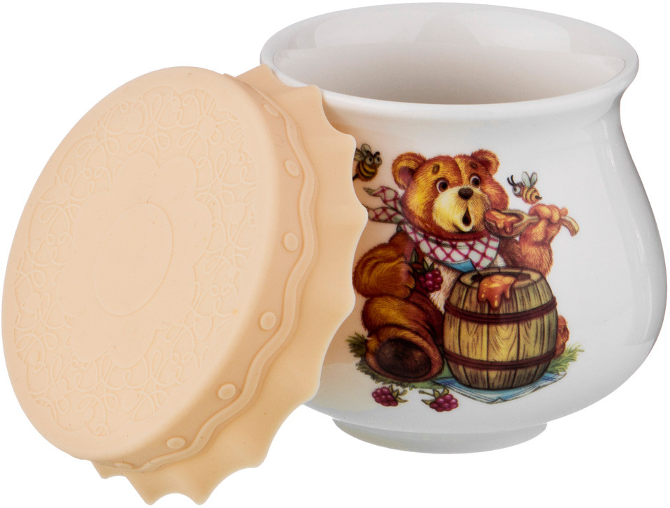 Очень симпатичная баночка! Хорошо, что горлышко широкое - удобно ложкой набирать содержимое банки! Брала в качестве подарка, пришелся к душе! Рисунок яркий, крышка закрывается плотно. Для хранения и подачи меда или варенья отлично придумано!